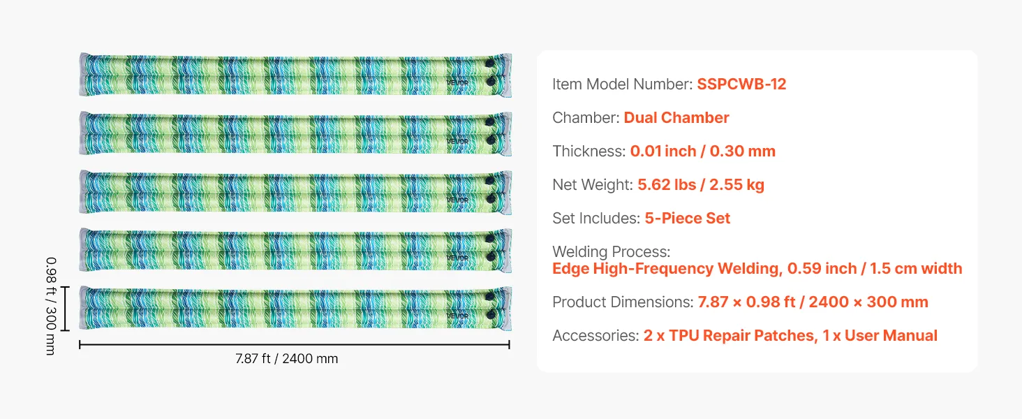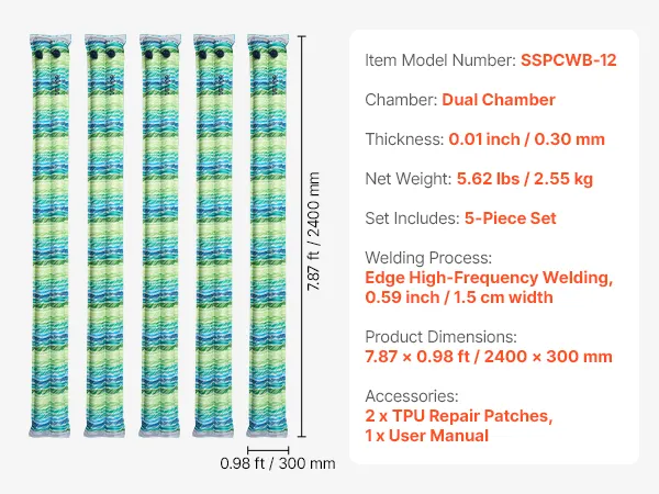 VEVOR Pool Cover Water Bags, 5 Packs 2400mm, Double Chamber Pool Cover Water Tubes with Reflective Strips, 0.3mm Thick PVC Bags Weights with Leakproof Screw Cap, for Winter Swimming-Pool Covers