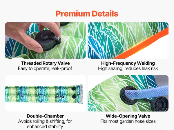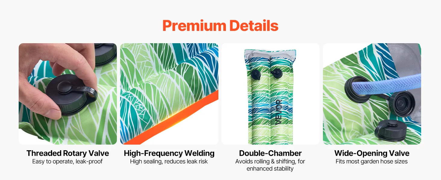 Equipped with an internal screw valve for smooth, leak-free operation. The wide opening fits most garden hoses for quick filling. High-frequency welded 0.59" seams ensure secure sealing, while the dual-chamber structure prevents rolling and shifting for added stability.