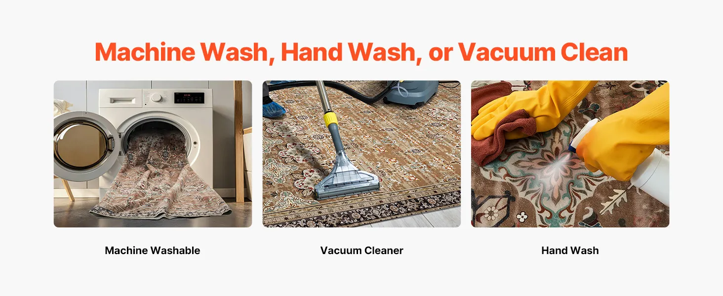 О: Наш ковер можно стирать вручную, пылесосом или в машине. Мы рекомендуем стирать его в барабанной стиральной машине с холодной водой и сушить естественным путем, без глажки или подогрева.