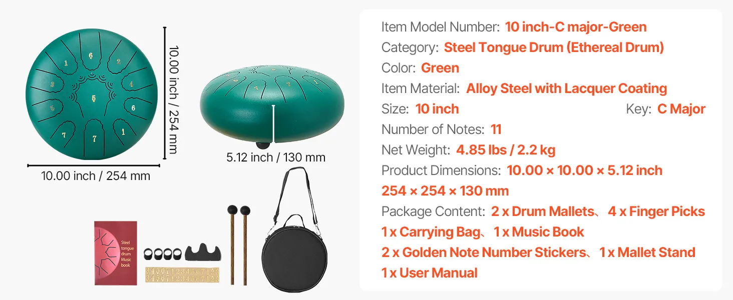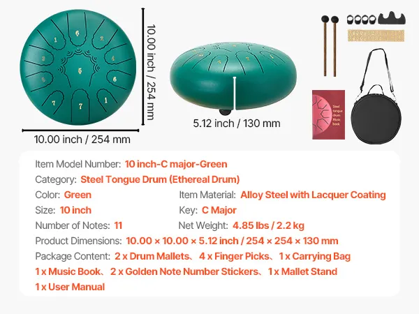 VEVOR Steel Tongue Drum, 25.4cm 11 Notes Rain Drum for Outside Garden, C Major Musical Drums with Music Book & Mallets, Percussion Instrument for Meditation Yoga Beginner Musical Education, Green