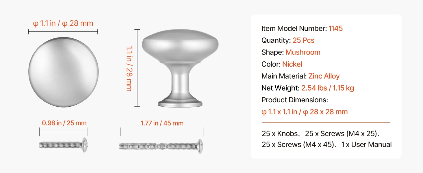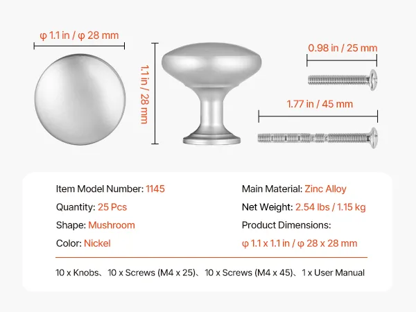 VEVOR Cabinet Knobs, 25 Pack, 28 mm Zinc Alloy Drawer Pulls Door Handles, Mushroom Kitchen Solid Knobs Dresser Handles, Cupboard Hardware with Screws for Bathroom Closet Cabinets Drawers, Nickel Color