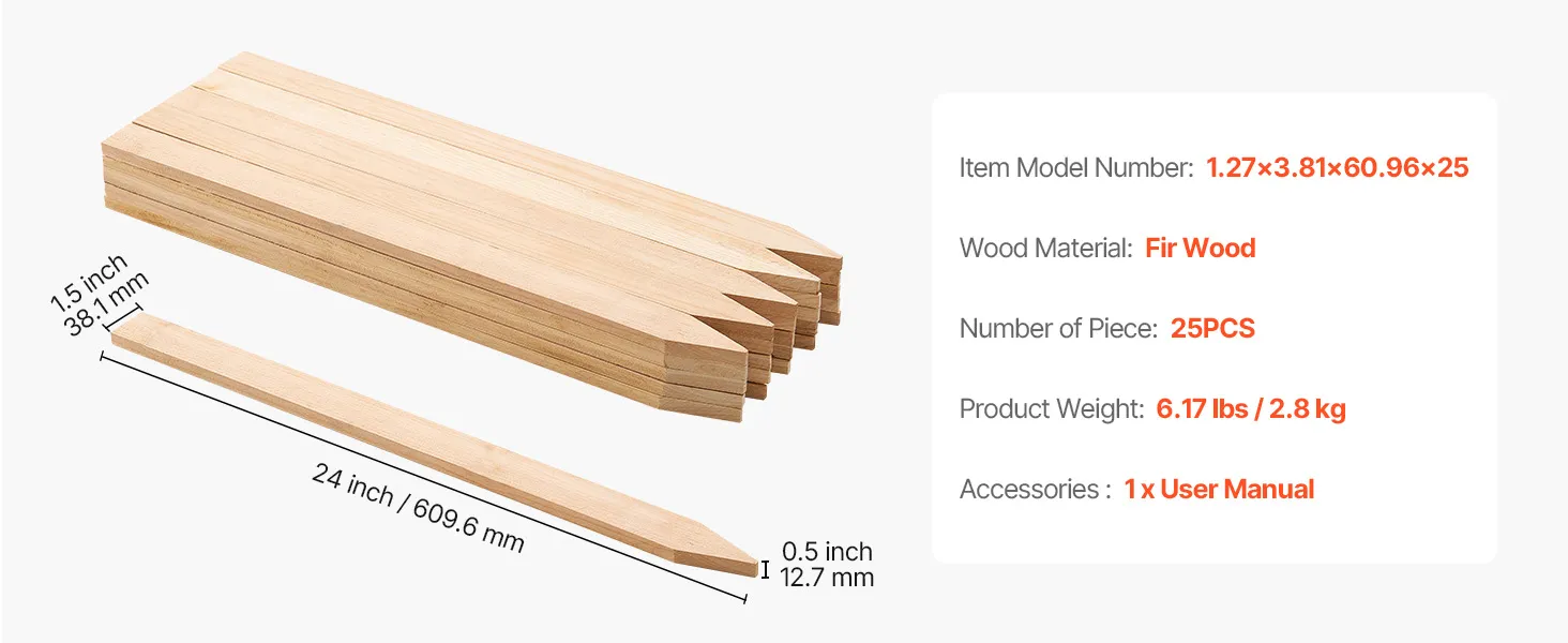 VEVOR Wooden Garden Stakes, 25 Pcs 12.7×38.1×609.6 mm Survey Grading Stakes, Garden Ground Stake with Sharp Point, Fir Wood Plant Support Stake, Sign Posts for Silt Fence Yard Boundaries Baselines