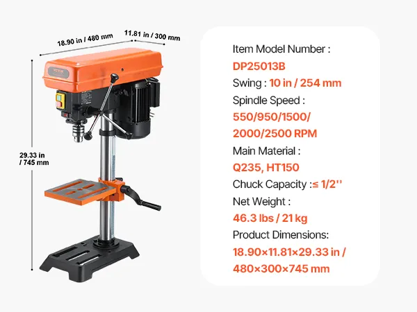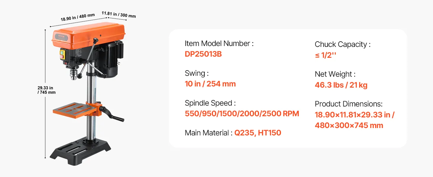 VEVOR 254 мм настольный сверлильный станок, 550Вт мотор, 5 скоростей 550–2500 об/мин, сверление 13 мм, стол с наклоном 0–45°, X-Ray позиционирование