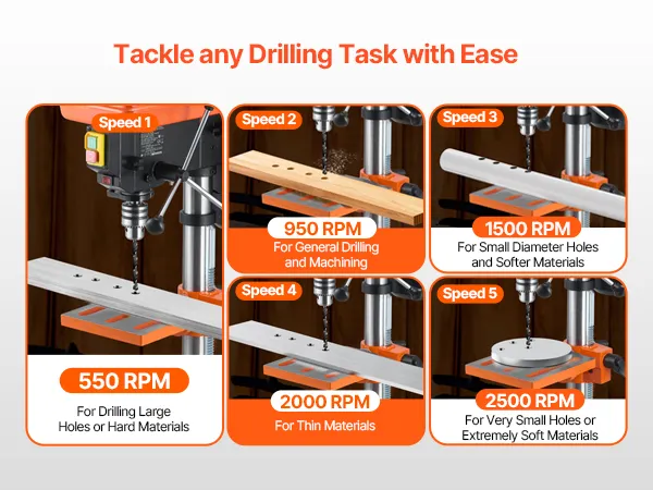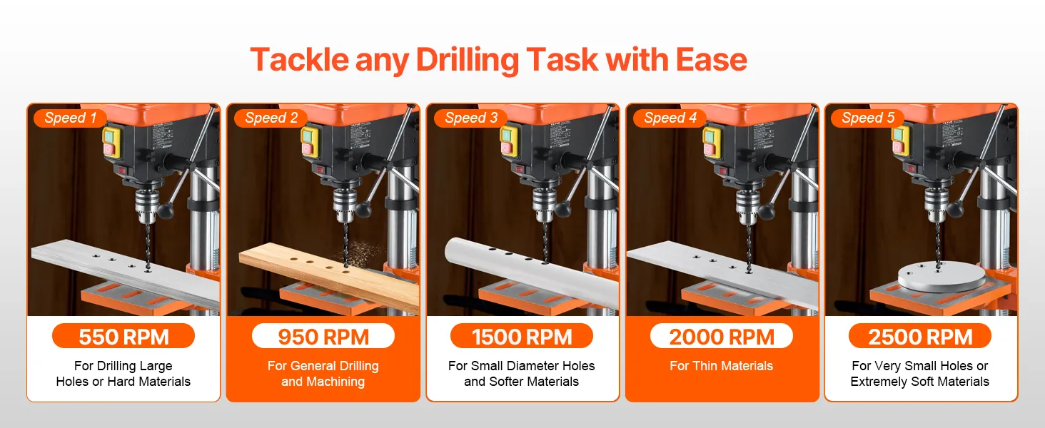 • Переменная регулировка 5 скоростей: Настройте свой опыт сверления с помощью пяти регулируемых скоростей в диапазоне от 550 до 2500 оборотов в минуту. Легко переключайтесь между скоростями, регулируя ленту, и наш настольный сверлильный станок позволит вам с высокой точностью работать с различными материалами и проектами.