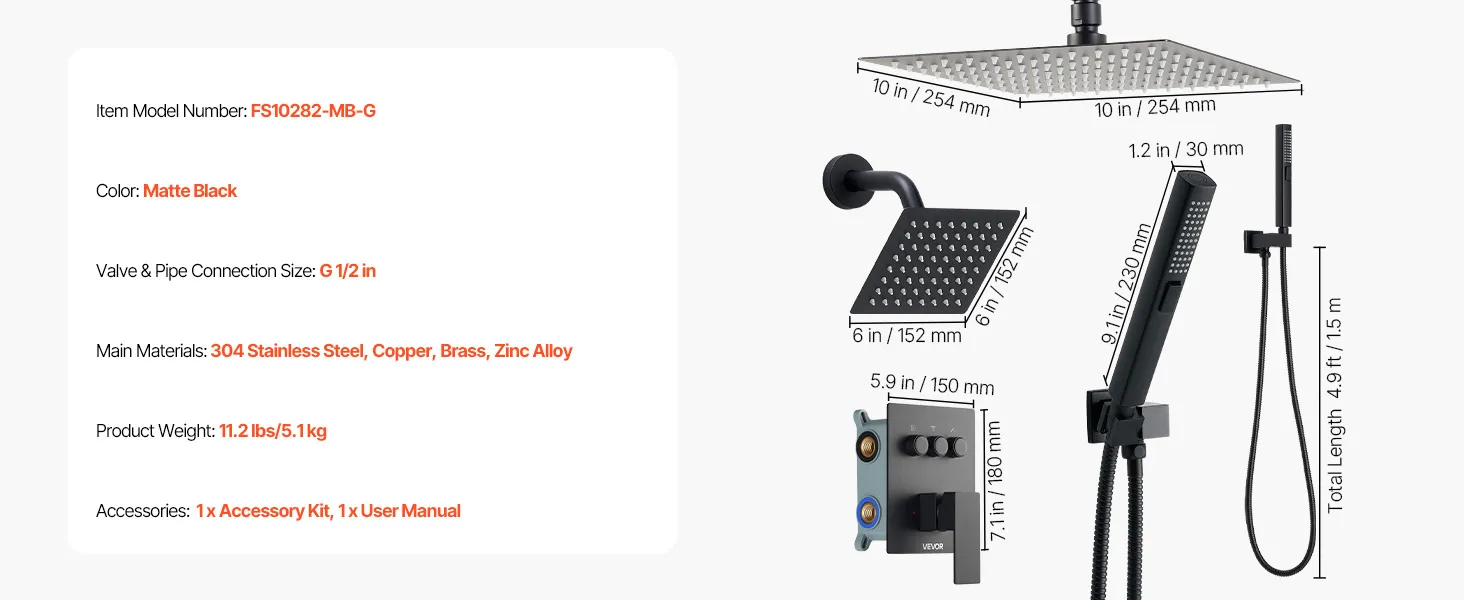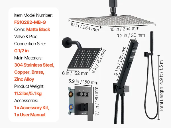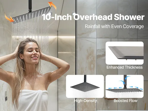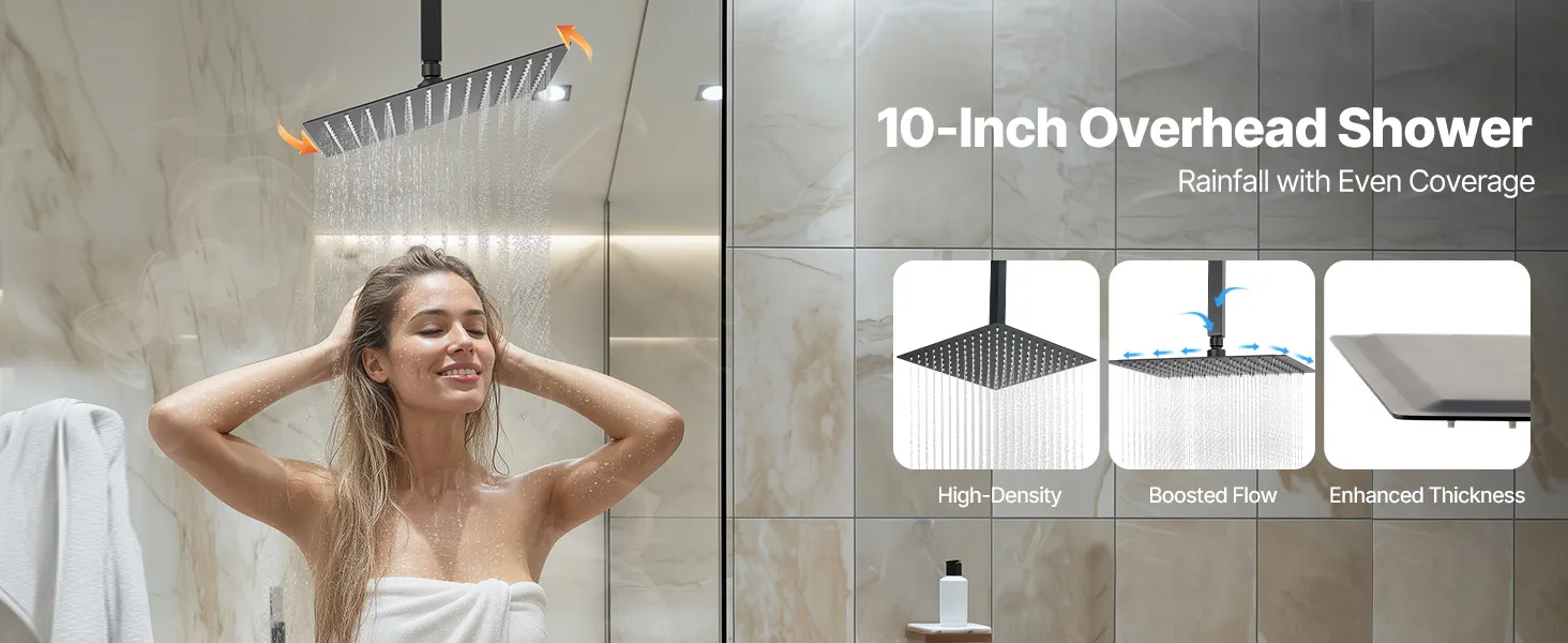 VEVOR Shower Faucet Set, 254 mm Ceiling Mount Rainfall Shower System with 152 mm Wall Mount Head and 2 in 1 Handheld Spray, Rotatable 3-Function Dual Rain Head Brass Valve and Trim Kit, Matte Black