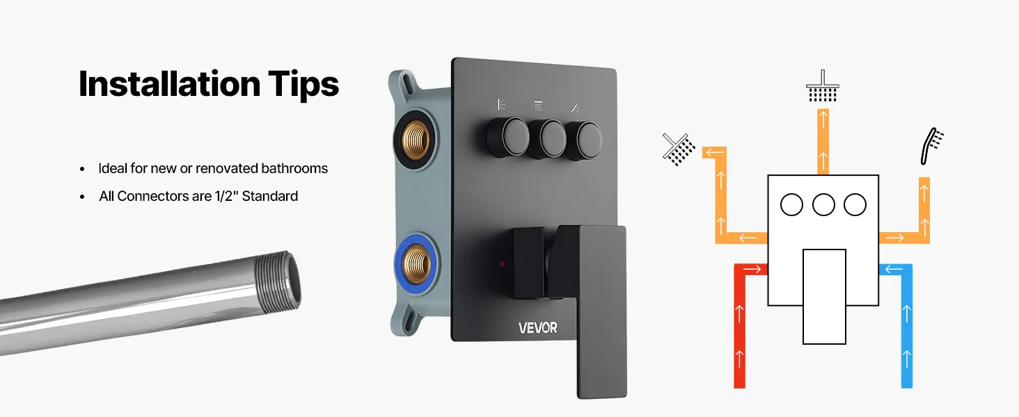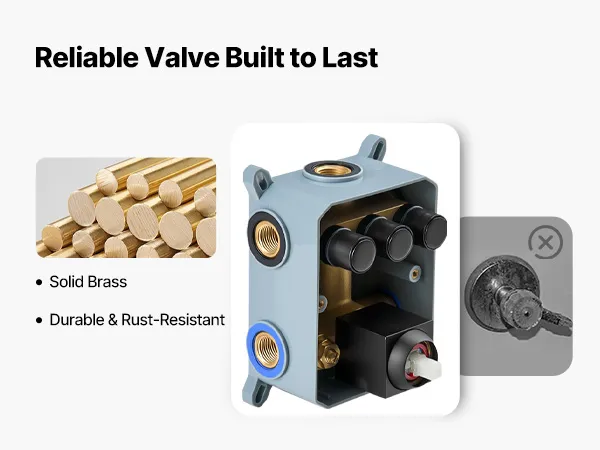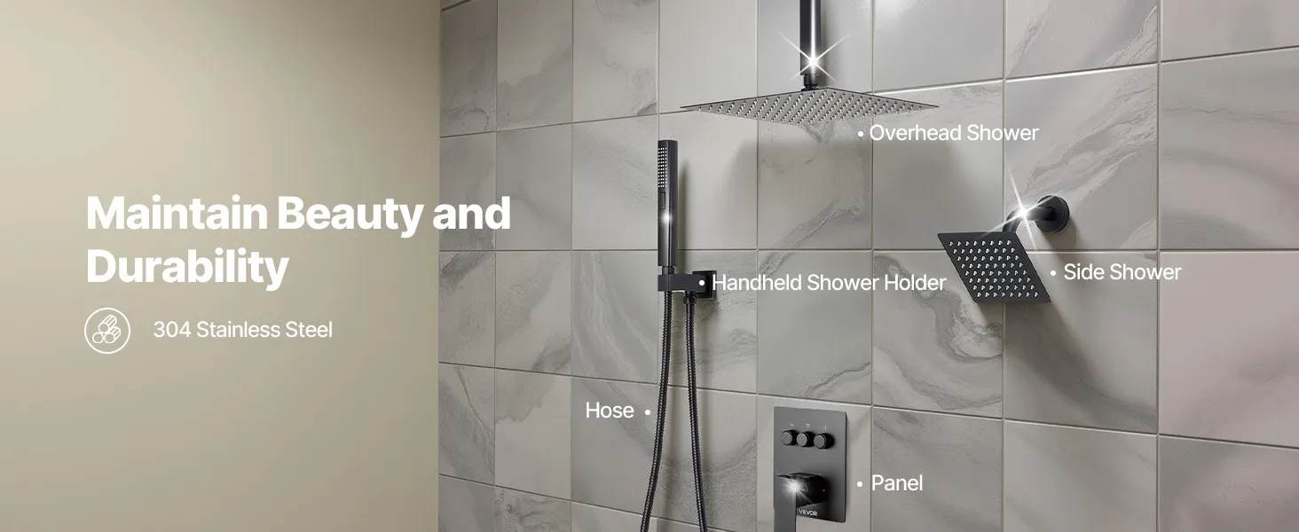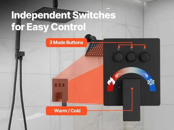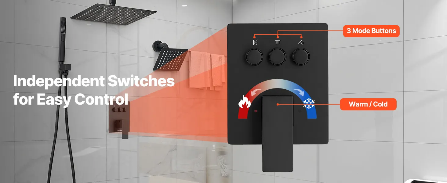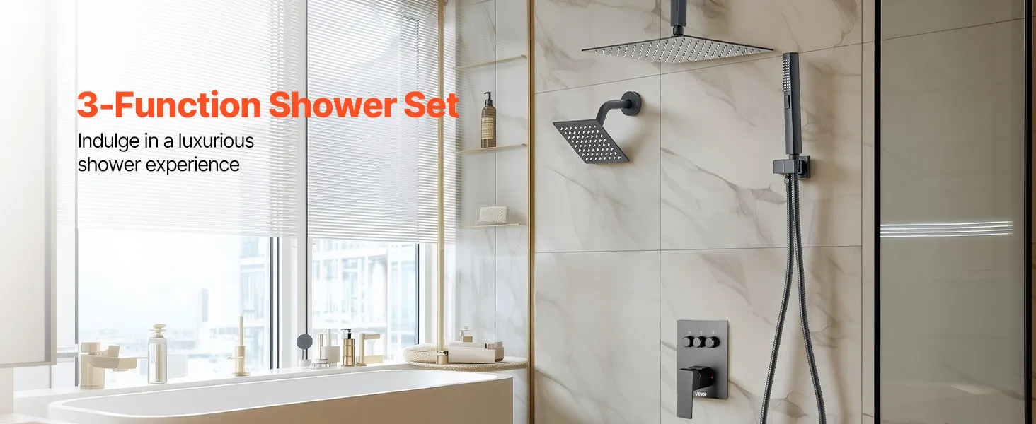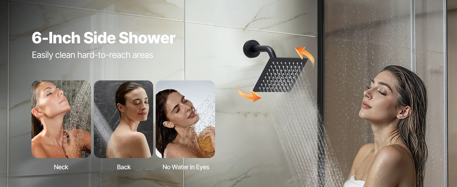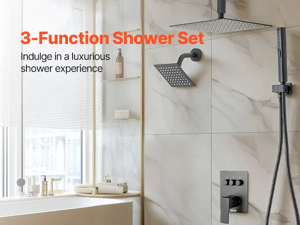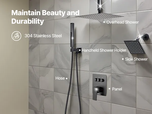 Our shower faucet set hides the plumbing behind the wall for a sleek, high-end bathroom look. It includes 3 refreshing shower functions—handheld, side, and overhead—for a full-body experience upgrade.