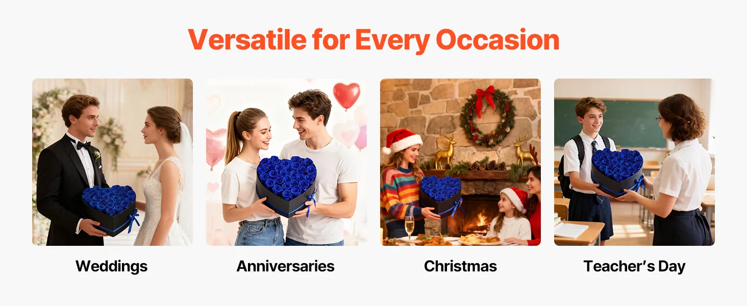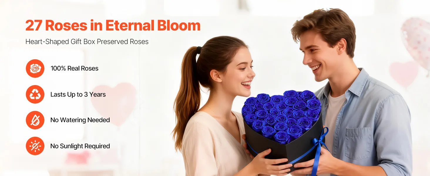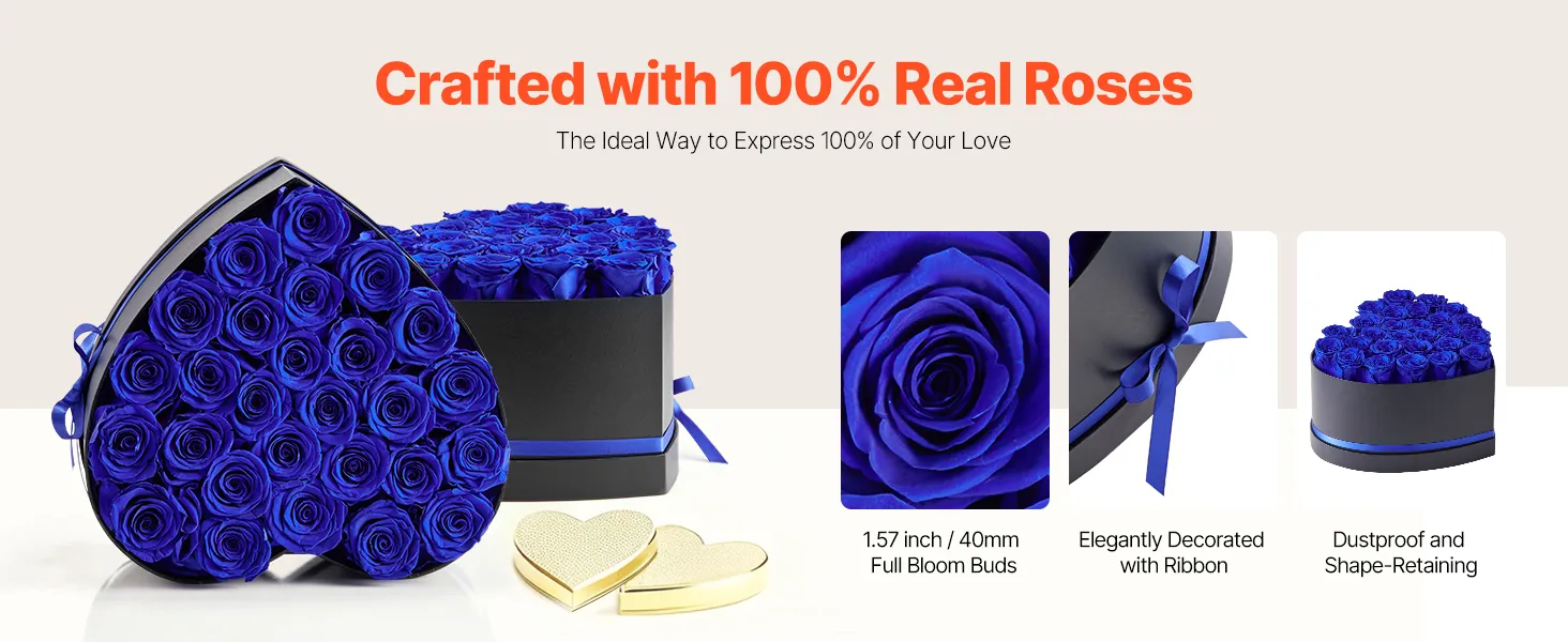 Made from 100% real roses with full blooms and vibrant colors, these forever roses require no watering or sunlight, turning every celebration into a lasting romantic memory.