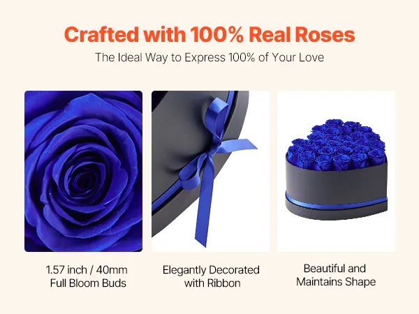 Featuring 1.57 inch / 40 mm natural rose buds, each bloom keeps delicate layers and texture With box and ribbon accents, this forever flowers bouquet remains elegant and steady for lasting beauty.