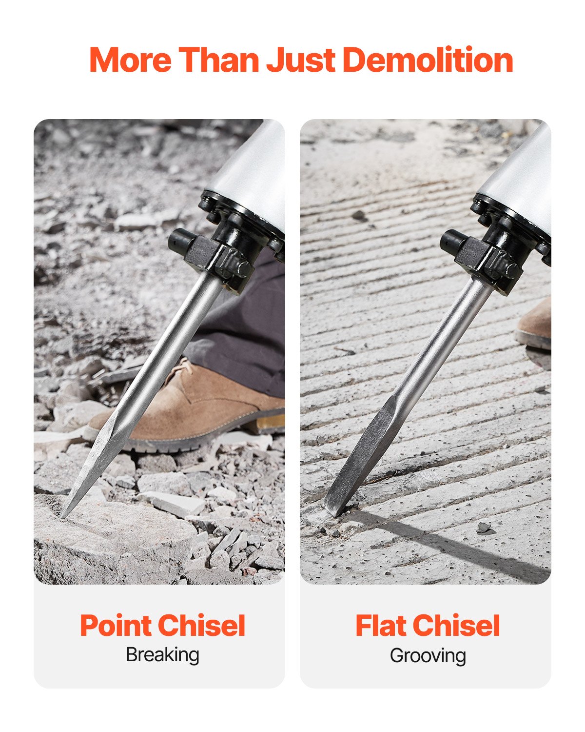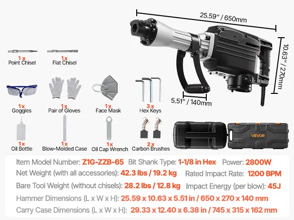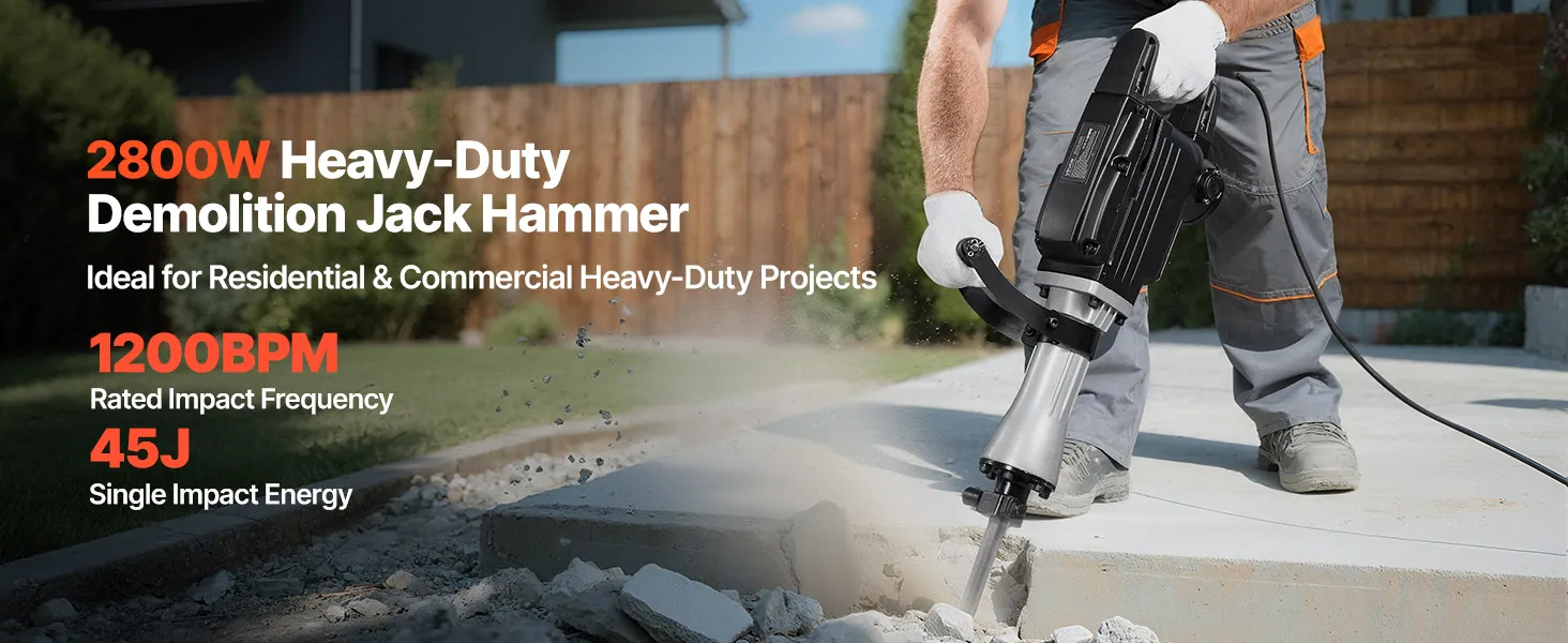 VEVOR Demolition Jack Hammer, 2800 W Powerful Electric Jackhammer, 1200 BPM Concrete Breaker with a Point Chisel, a Flat Chisel, Carrying Case, Gloves, for Concrete, Wall, Brick, Tile and Foundation