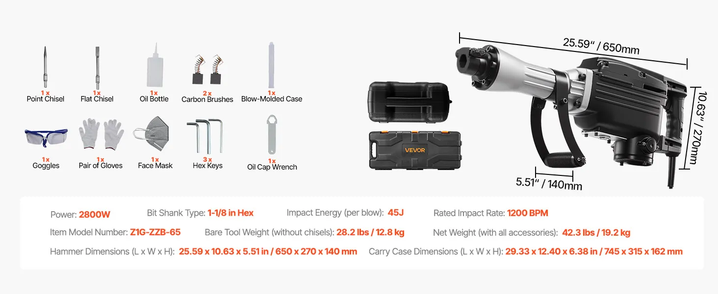 This demolition hammer features a 2800 W motor delivering 1200 BPM to break concrete, brick, and other tough materials. A 360° handle provides better control and less fatigue, while the aluminum housing ensures strength, durability, and cooling. Ideal for home or professional use.