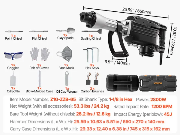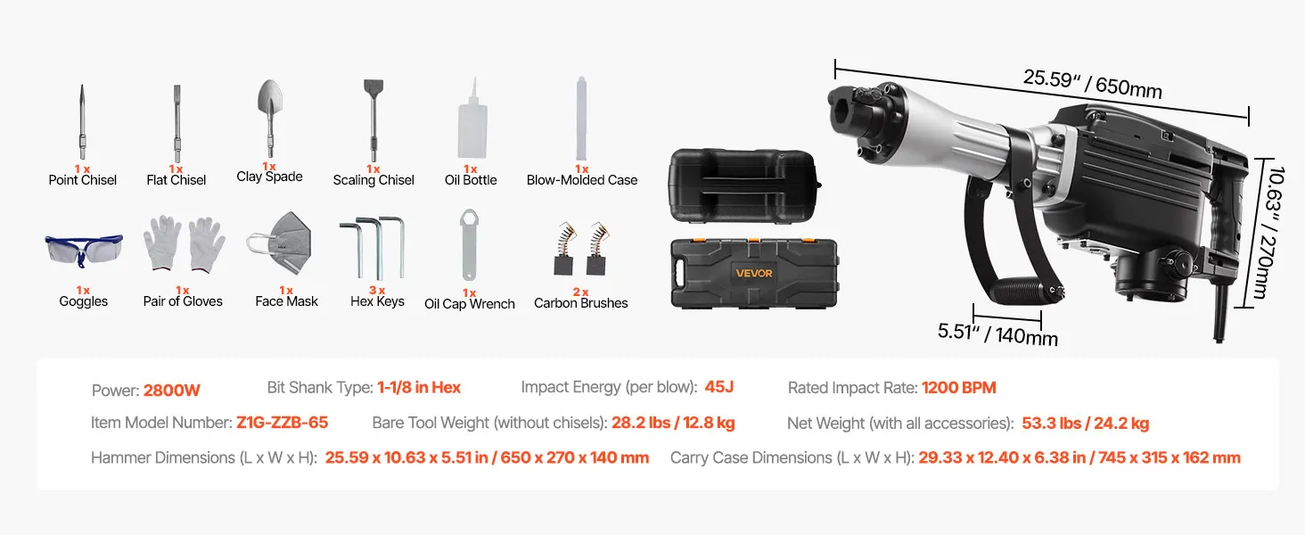 VEVOR Demolition Jack Hammer, 2800 W Powerful Electric Jackhammer, 1200 BPM Concrete Breaker with 3 Chisels, a Clay Spade, Carrying Case, Gloves, for Concrete, Wall, Brick, Tile and Foundation