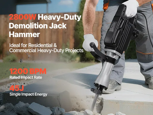 This demolition hammer features a 2800 W motor delivering 1200 BPM to break concrete, brick, and other tough materials. A 360° handle provides better control and less fatigue, while the aluminum housing ensures strength, durability, and cooling. Ideal for home or professional use.