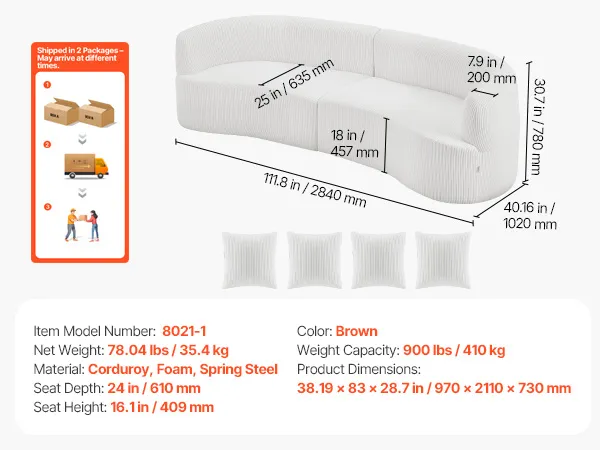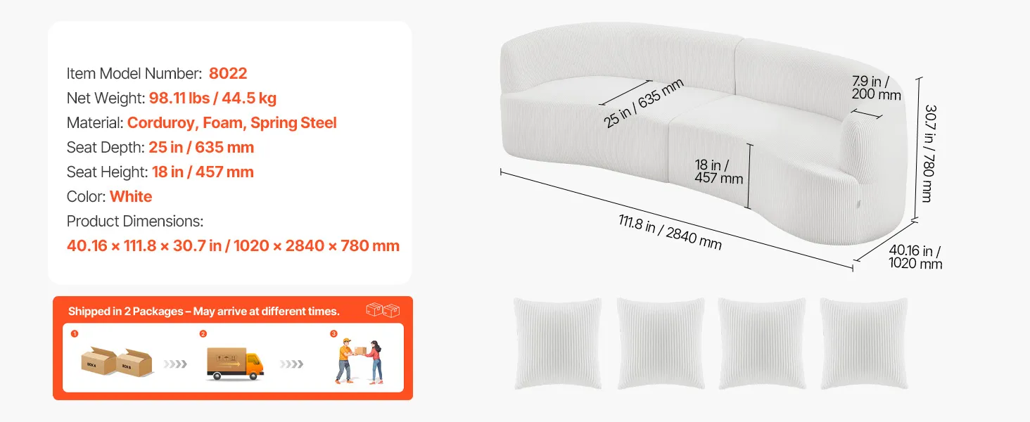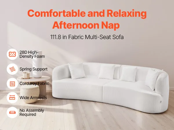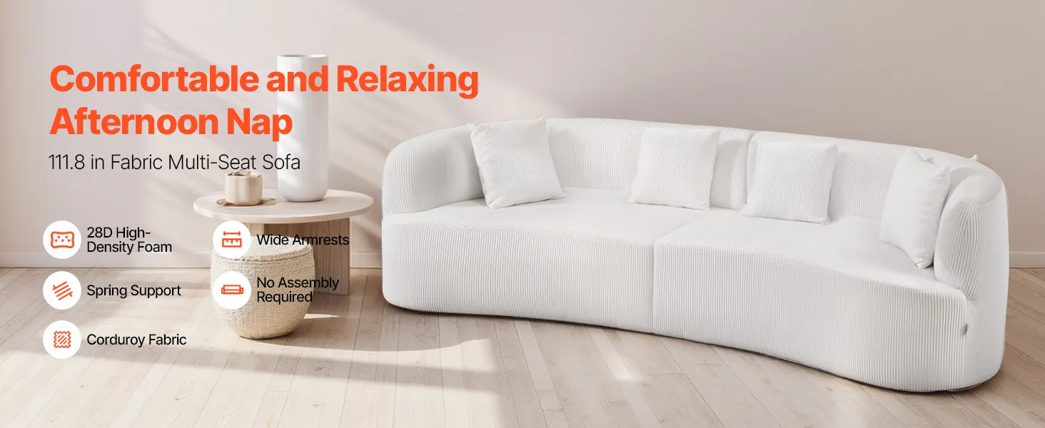 This 111.8 in / 2840 mm sofa couch features 28D high-density foam and a spring coil system for exceptional comfort and support. The skin-friendly, breathable corduroy fabric and wide armrests provide a soft, pleasant touch. With no assembly required, simply unbox, let it settle for 48-72 hours.