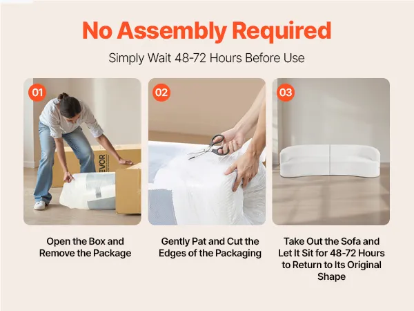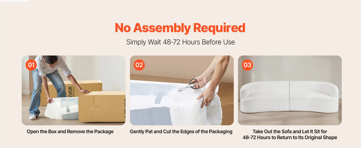 Designed for ease of use, this curved modular sofa requires no assembly. Just unbox, gently fluff, and let it rest for 48-72 hours before use.
