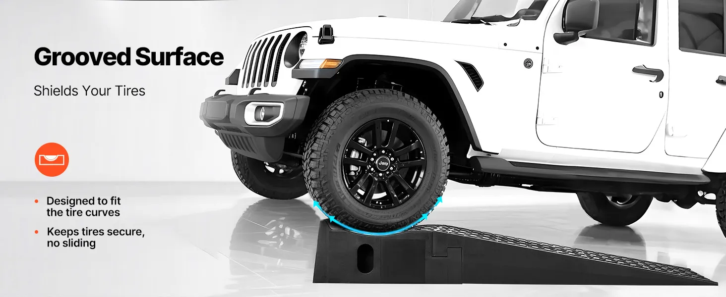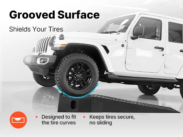 The car lift ramp surface features deep grooves to fit the tire curves, holding tires firmly in place. This design minimizes slippage and avoids tire damage.