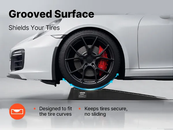 The car lift ramp surface features deep grooves to fit the tire curves, holding tires firmly in place. This design minimizes slippage and avoids tire damage.