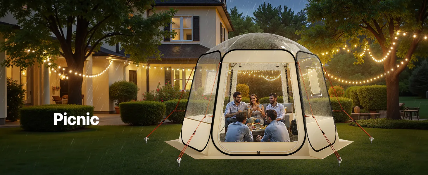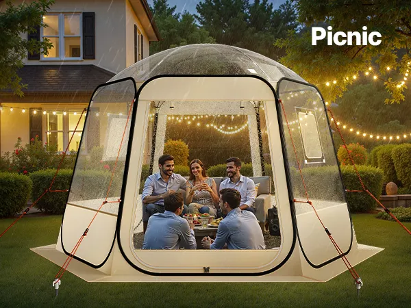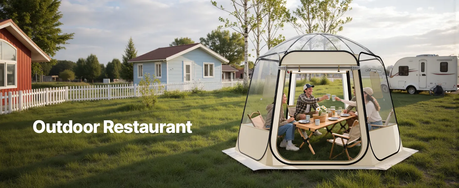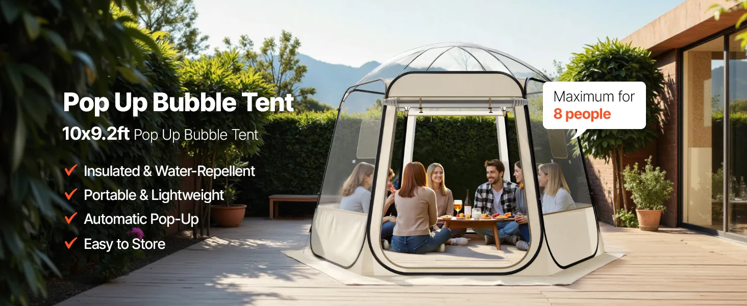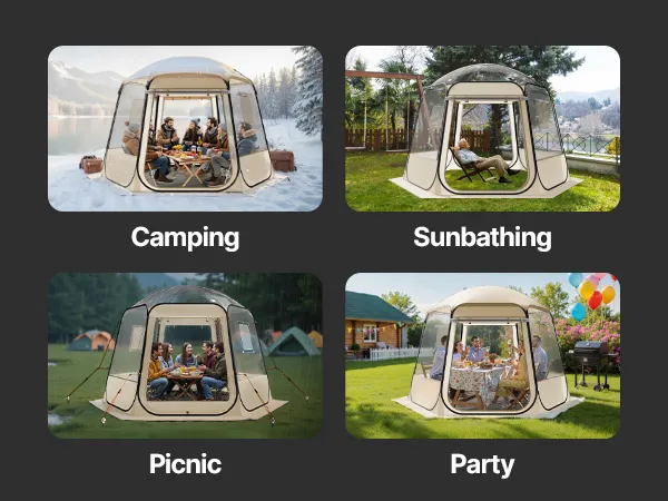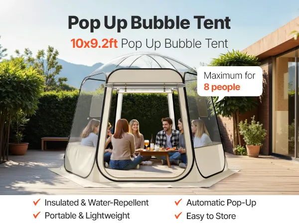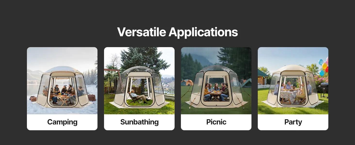 This 4–8 person pop-up bubble tent is made of TPU and 210D Oxford fabric, with steel wire for stability and durability. The pop-up structure allows for quick setup in seconds, making it ideal for outdoor or backyard use. Multiple roll-up side windows let you easily adjust airflow and privacy.