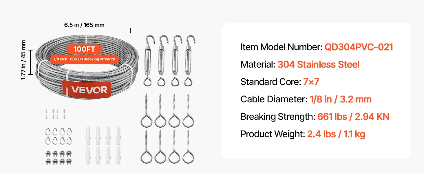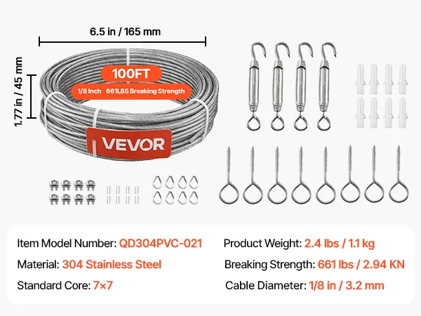 VEVOR 3.2 mm Wire Rope Kit, 30.5 m Length, 304 Stainless Steel Wire Cable, 2.9 kN Breaking Strength, 7 x 7 Strands Construction, Steel Cable for Deck Railing System, Garden Trellis, String Lights