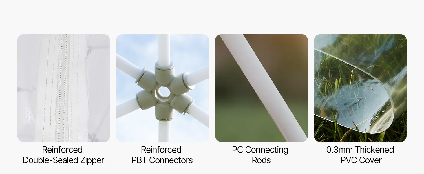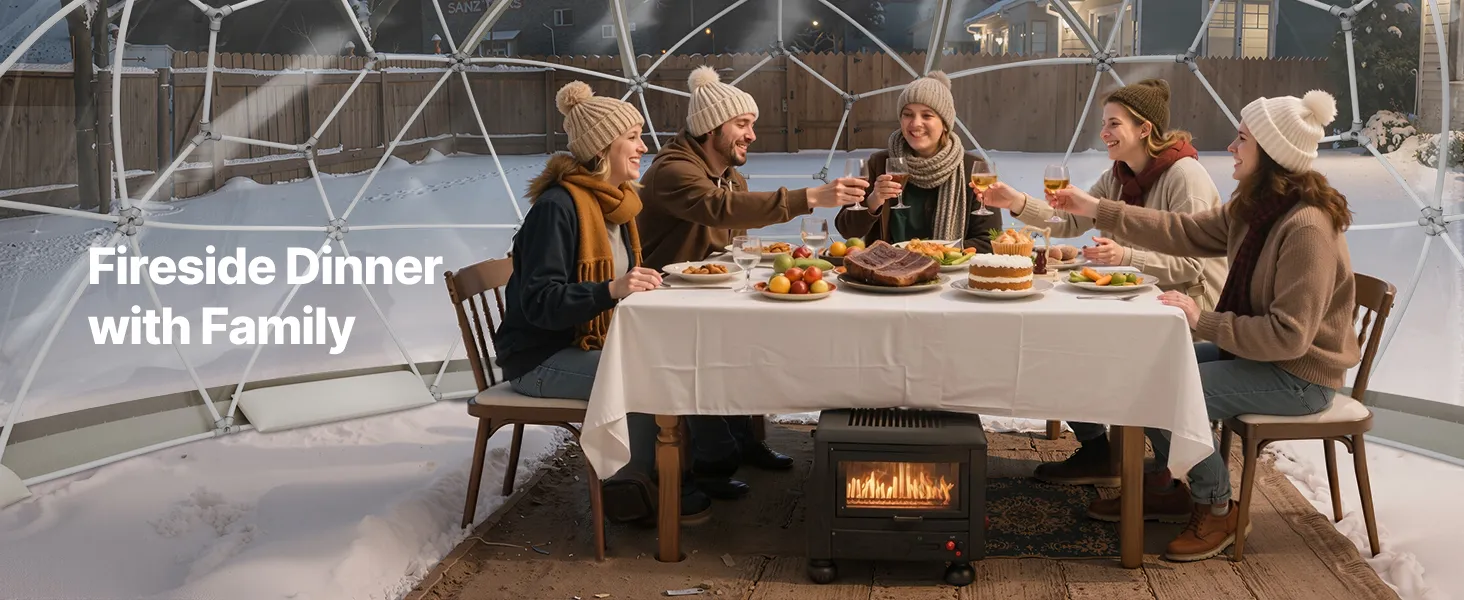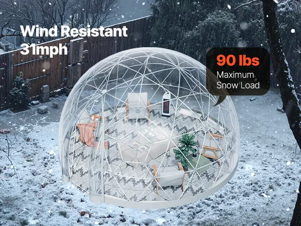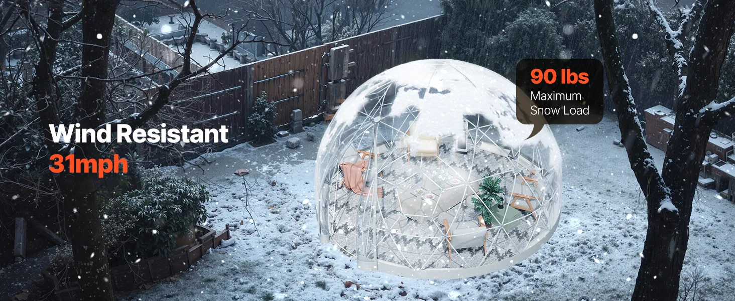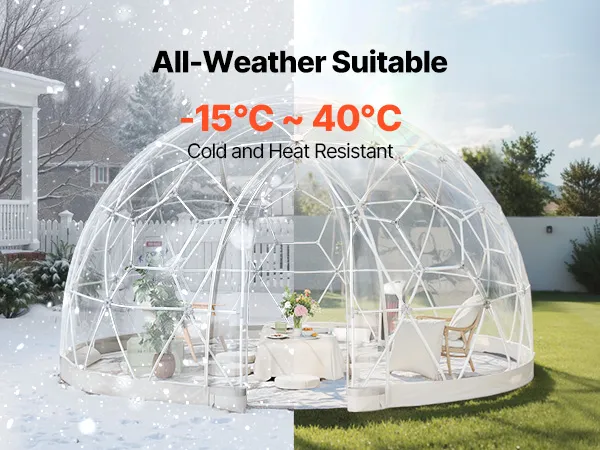 A: This dome tent is designed for all-season use. The 0.3mm thick cold-resistant PVC cover and reinforced windproof frame allow it to withstand temperatures ranging from -15°C to 40°C (5°F to 104°F), providing excellent insulation and protection. For winter use, we recommend placing a heater inside the tent to maintain a warm and comfortable environment.