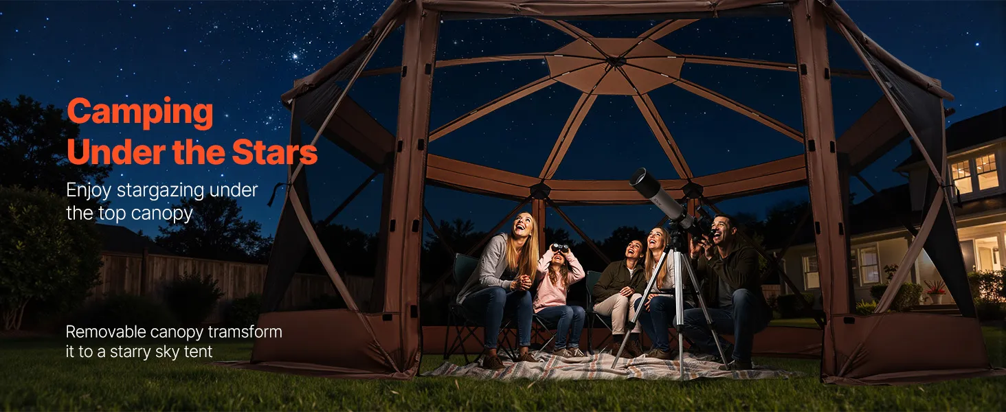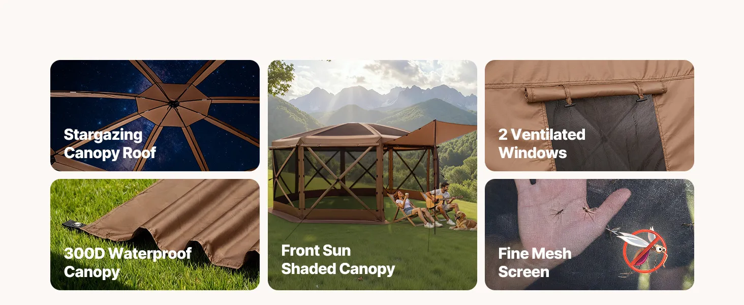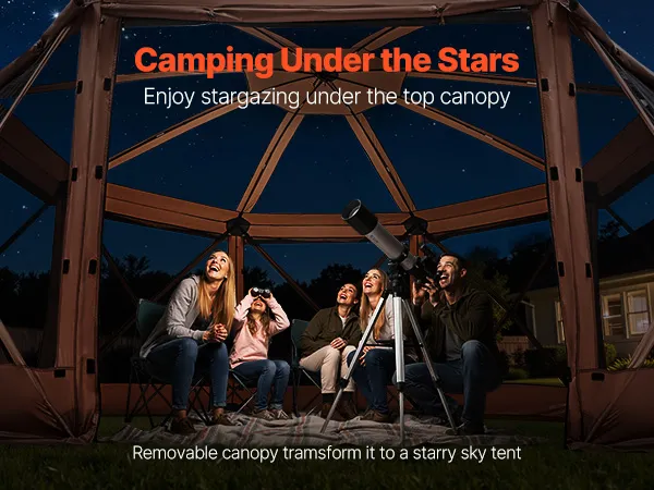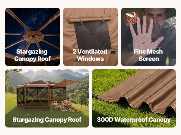 • 3-in-1 Outdoor Living Space: This camping gazebo tent features convertible door panels double as upgraded sunshade canopies. Durable 300D Oxford canopy with UV50+ protection shields from sunlight, while PU coating keeps rain out. Mesh “starry sky” roof offers an open view for stargazing fun