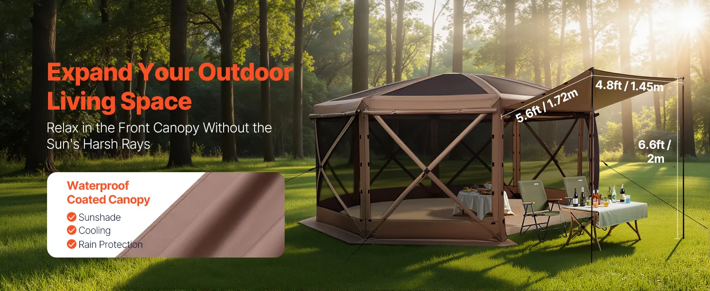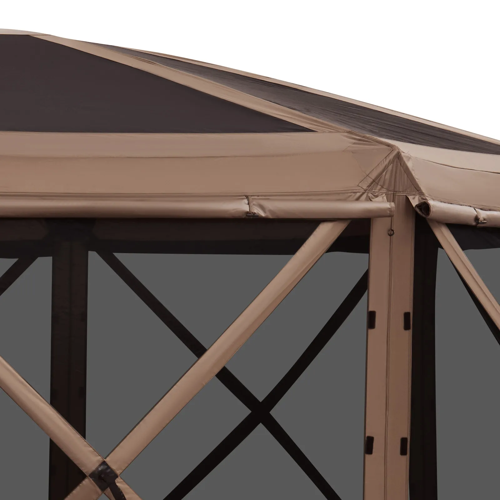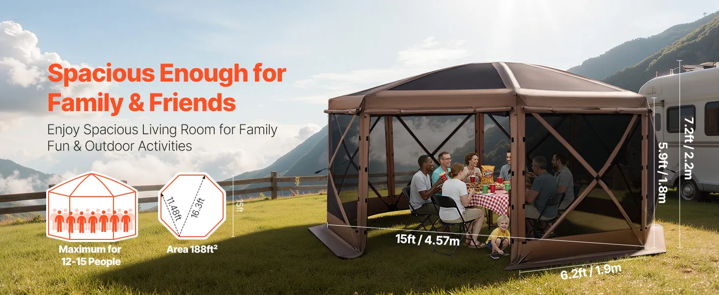 VEVOR 3.6×3.6 m 8-Sided Pop-Up Gazebo Tent for 12-15 People, UV-Proof Screen Canopy with Removable Roof & Bag, Brown