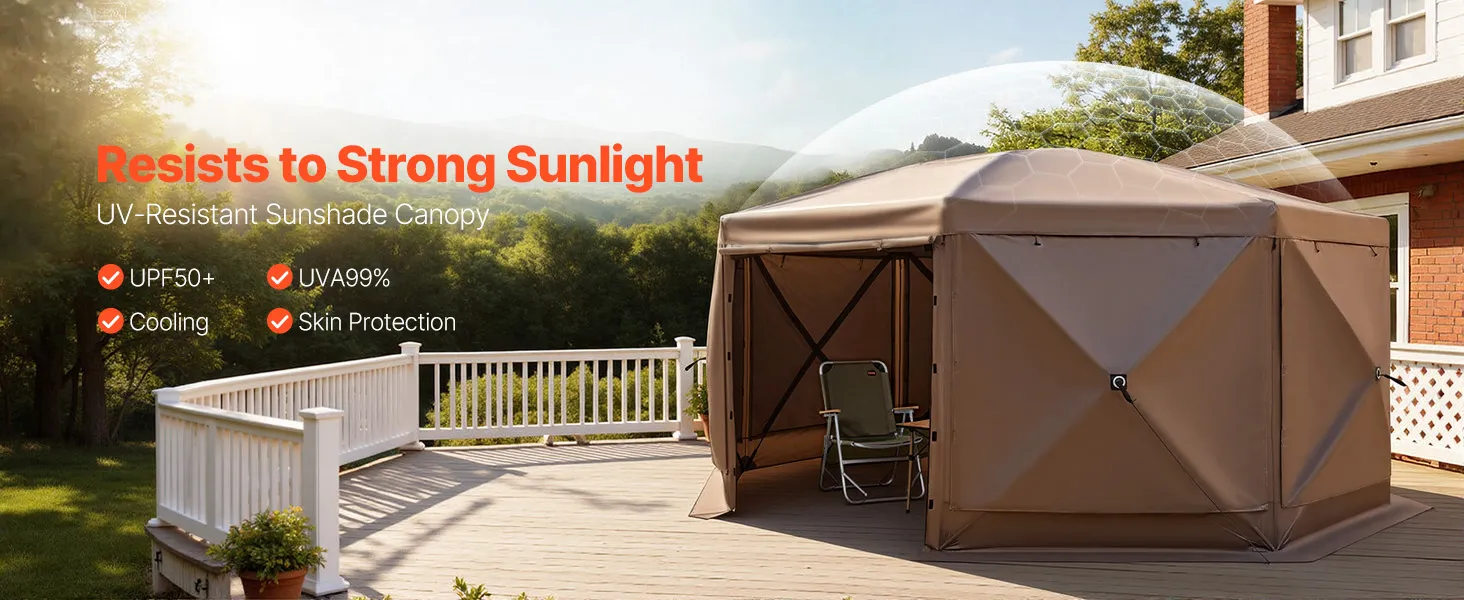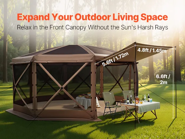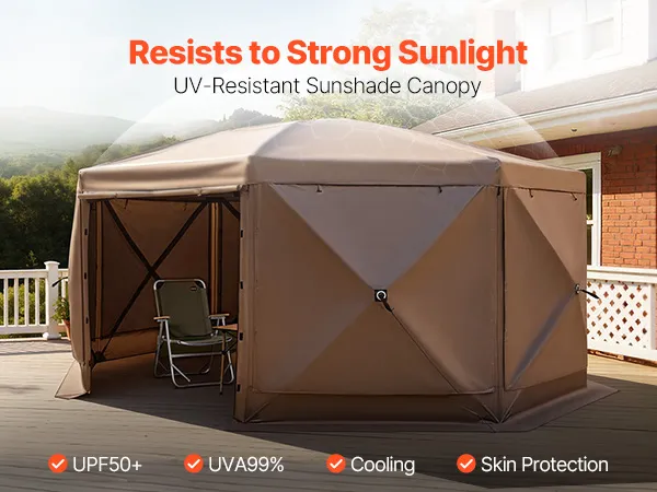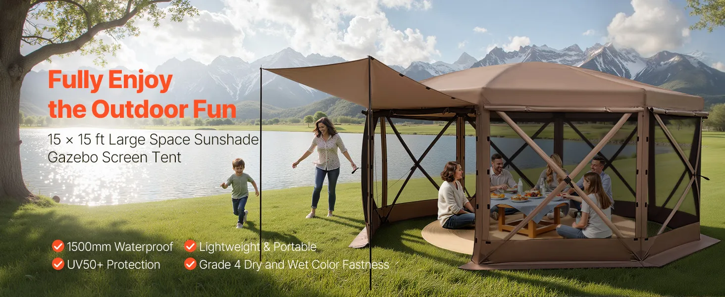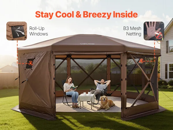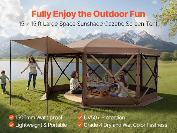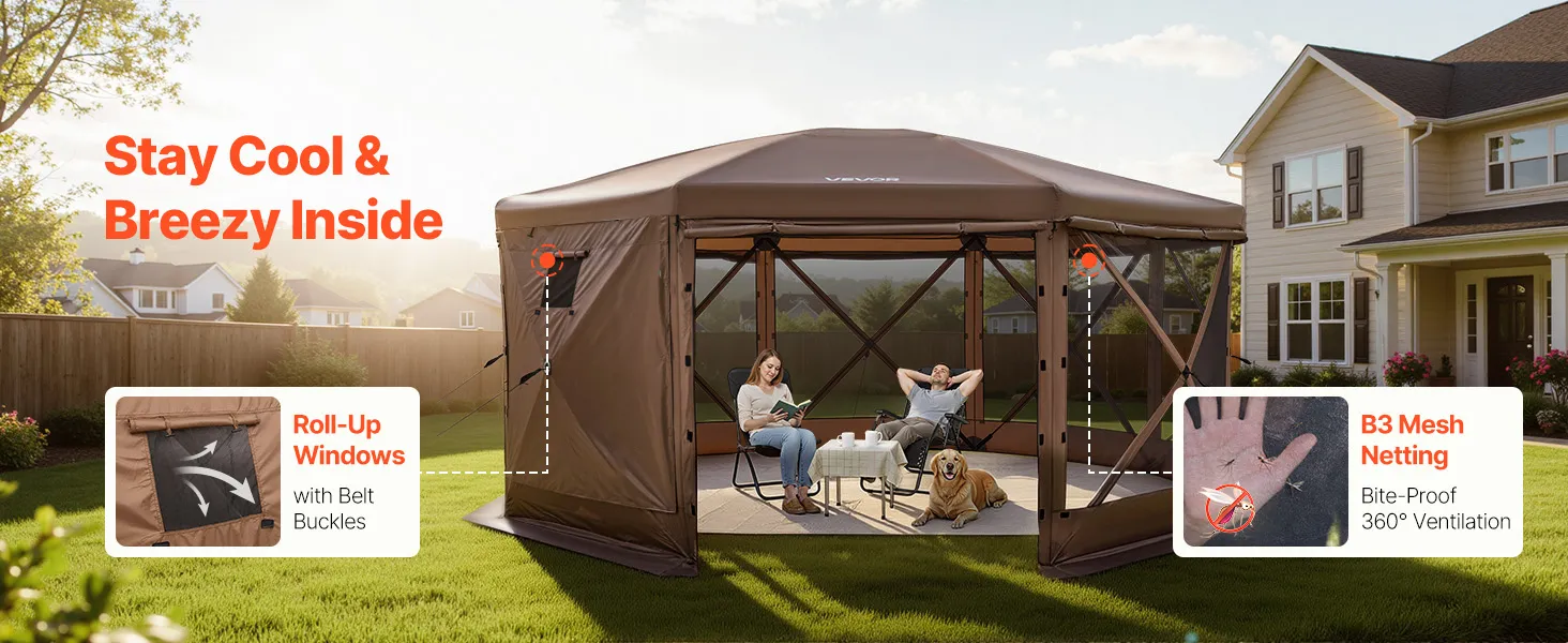 VEVOR 3.6×3.6 m 8-Sided Pop-Up Gazebo Tent for 12-15 People, UV-Proof Screen Canopy with Removable Roof & Bag, Brown