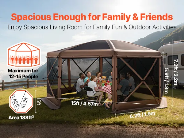• Spacious Room for 15 People: This 15×15 ft pop-up gazebo screen tent comfortably fits 10 seated with furniture, accommodates up to 12-15 people for activities. 7.2 ft high canopy allows easy movement inside. Zippered and tie-back door panels ensure easy entry and exit. Ideal for family gatherings, parties, and camping
