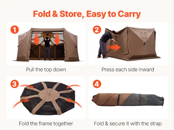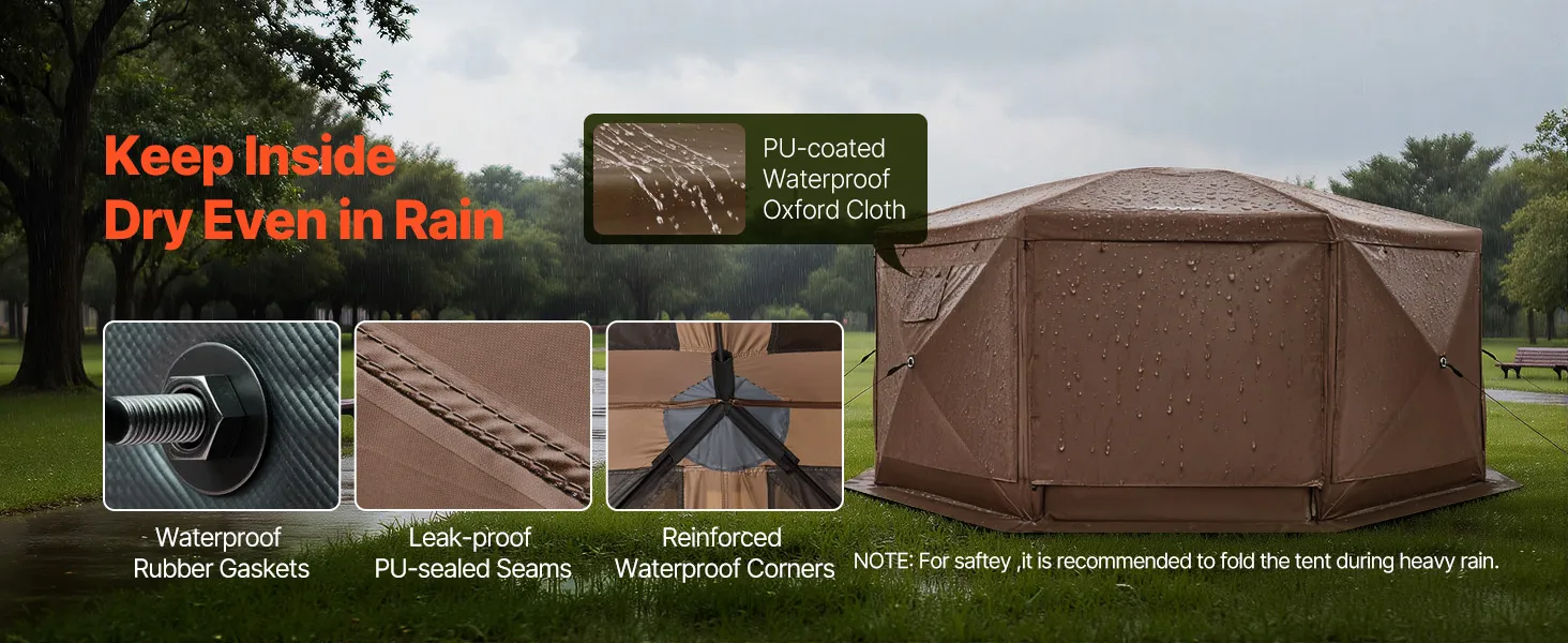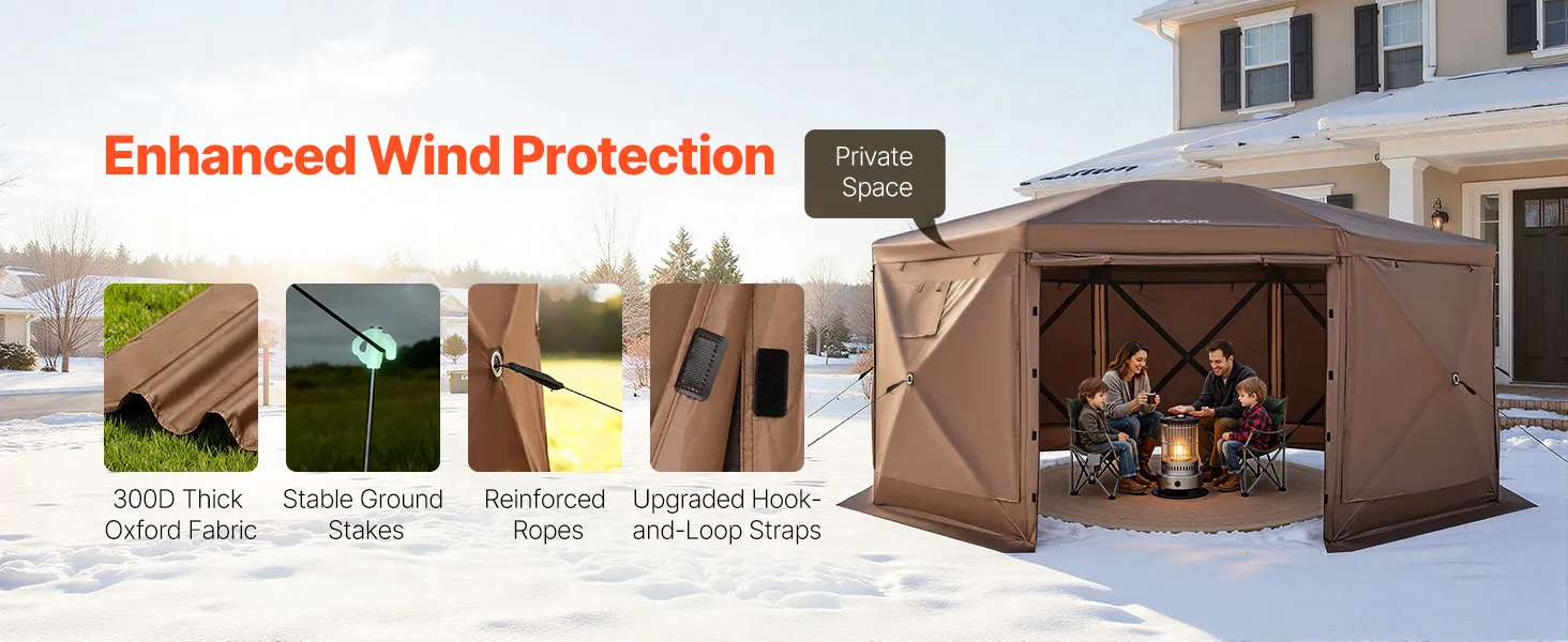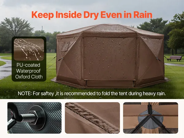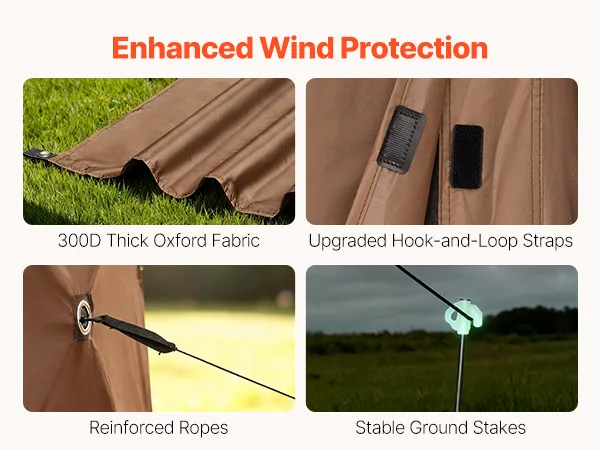 • Wind-Resistant Structure: High-strength fiberglass poles and eight reinforced roll-up wind panels enhance stability and privacy. Side loop-and-loop closures prevent panels from flapping in the wind. The pop up canopy includes multiple ground stakes and guy ropes for secure outdoor setup. (Tip: Disassemble during heavy rain or storms for security.)