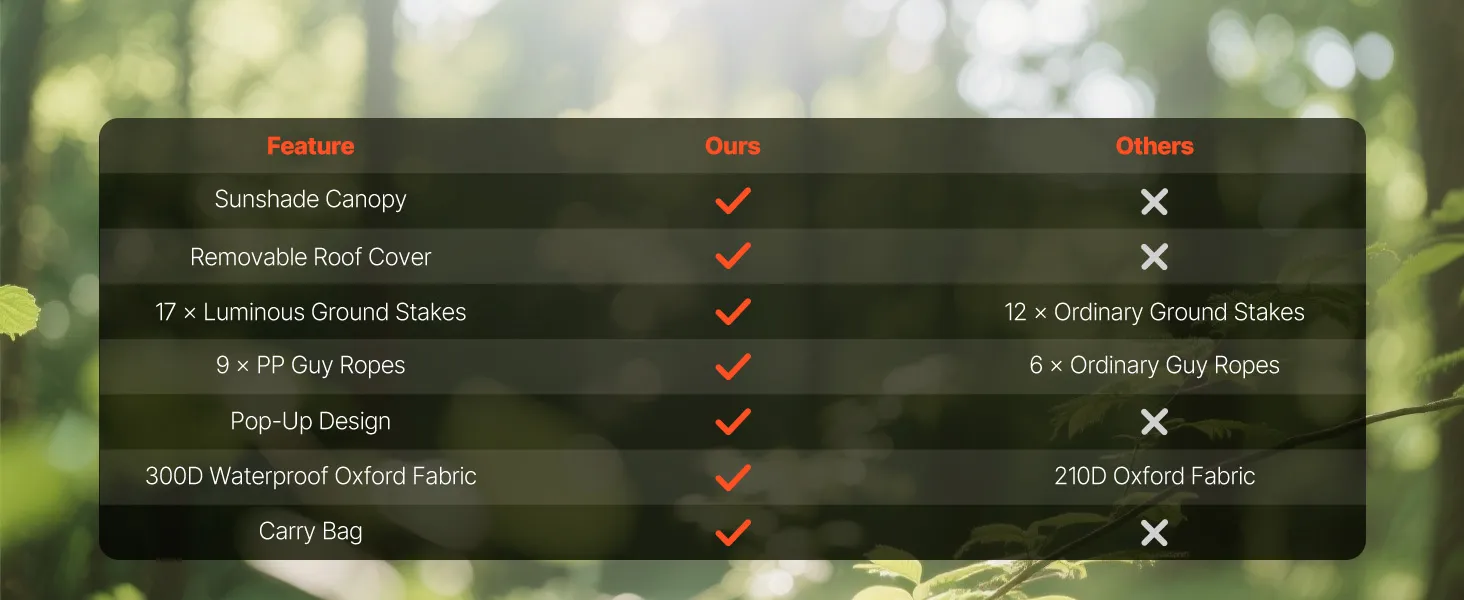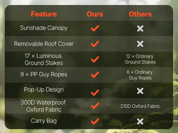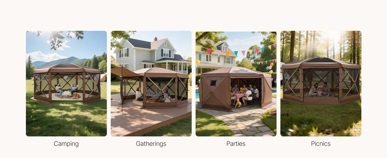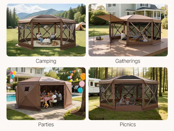 • 360° Ventilation: Mesh sidewalls and roof allow airflow while keeping critters out. Two roll-up wind panels with ventilation windows maintain air circulation even when fully closed. The canopy shelter tent provides a comfortable for adults