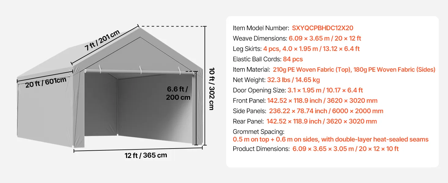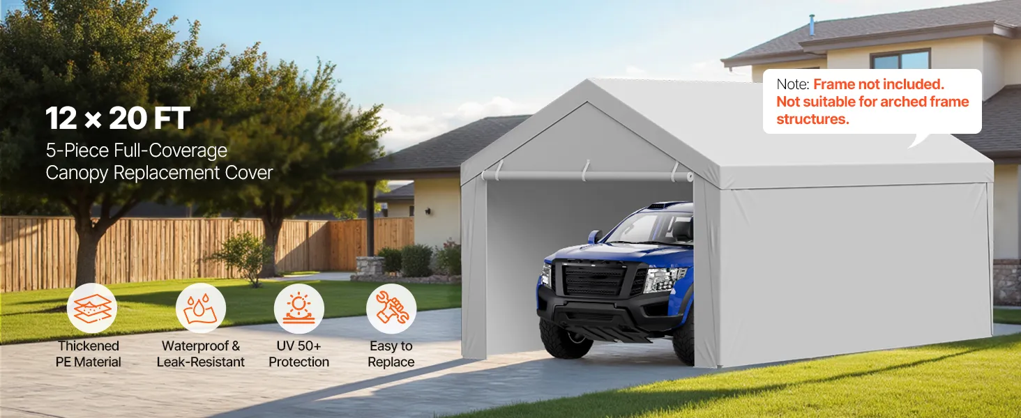 The standard 12×20 ft carport replacement cover is designed to fit most carport frames. No trimming or modifications required for easy replacement. It is ideal for quick DIY replacement.