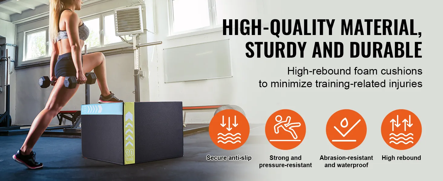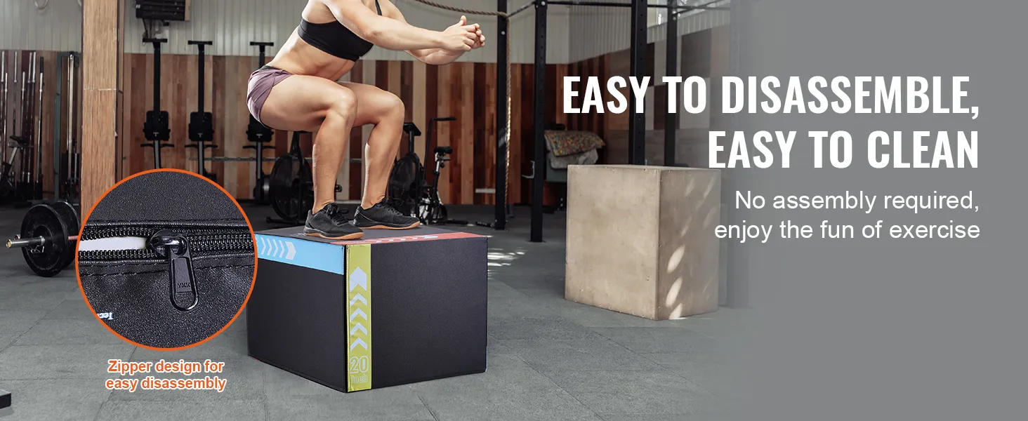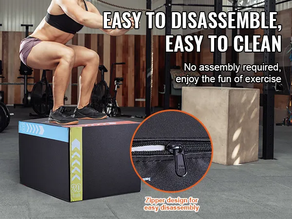 • Установка не требуется: Цельный plyo box готов к использованию без установки и оснащен застежкой-молнией для легкой разборки и чистки. Покрытие из ПВХ позволяет быстро и удобно протирать бокс, устраняя грязь и следы ног, поддерживая гигиену и эстетику в вашем тренировочном зале.