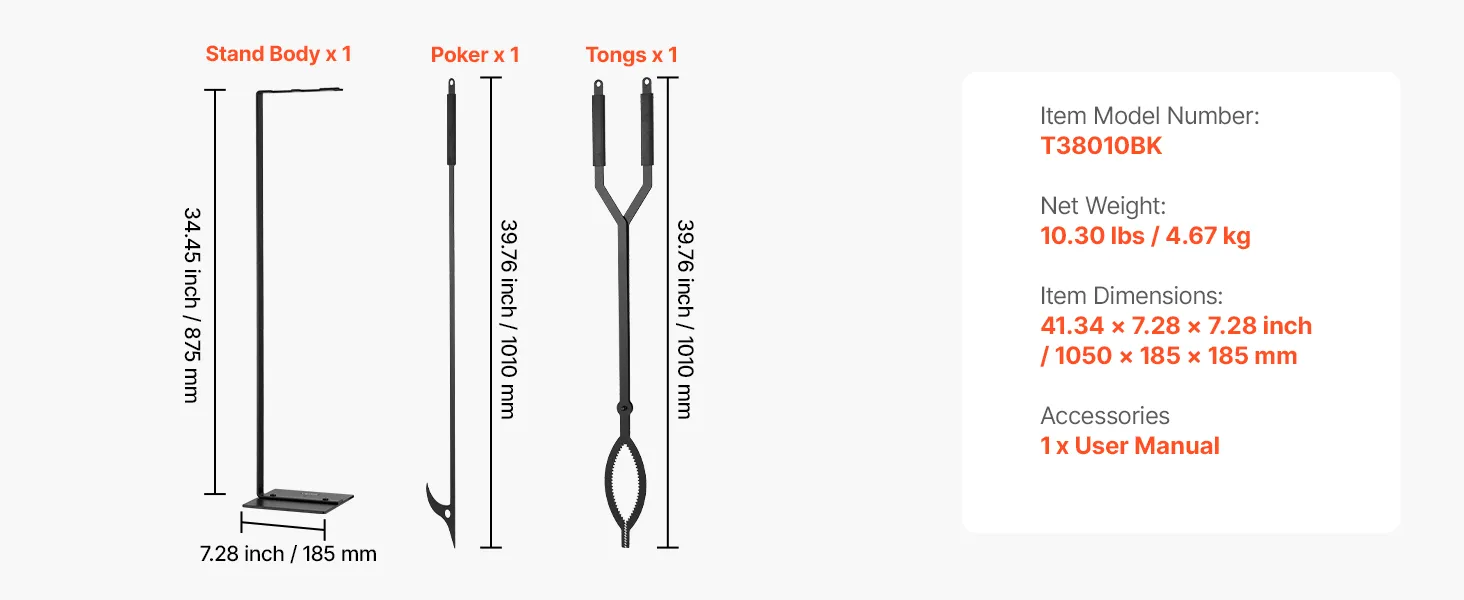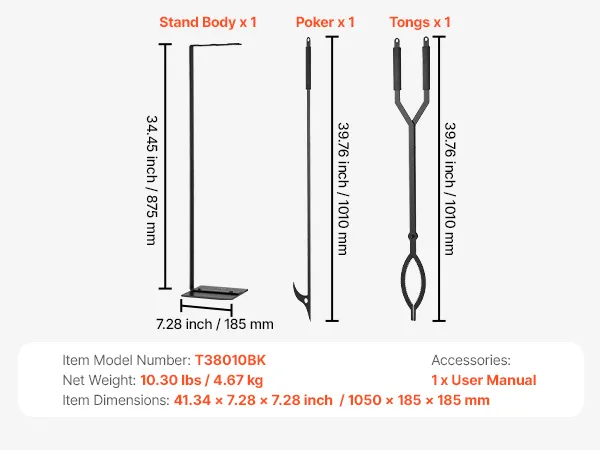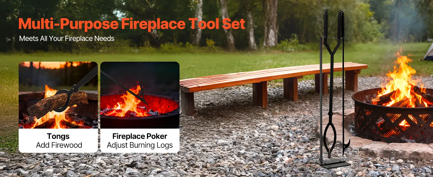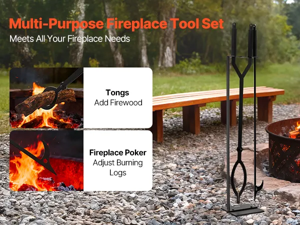 The fire place set tools cover all needs. The tongs securely add firewood, the poker easily adjusts burning logs to boost combustion efficiency. Each tool works together to simplify fireplace maintenance and improve burn performance.