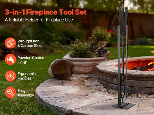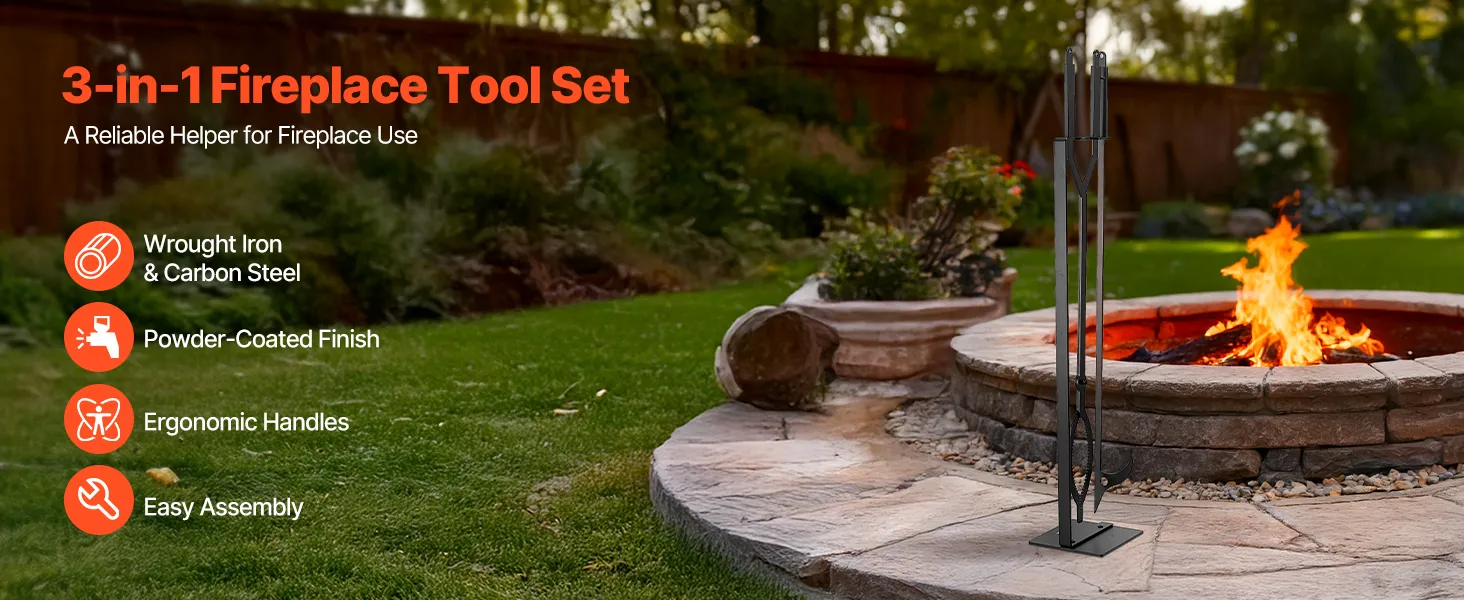 Crafted from premium wrought iron, carbon steel, and powder-coated finish, this fireplace tool set resists bending, rust, and high heat for long-lasting durability. The ergonomic extended handles provide a comfortable, heat-resistant grip, an essential helper for fireplace use.