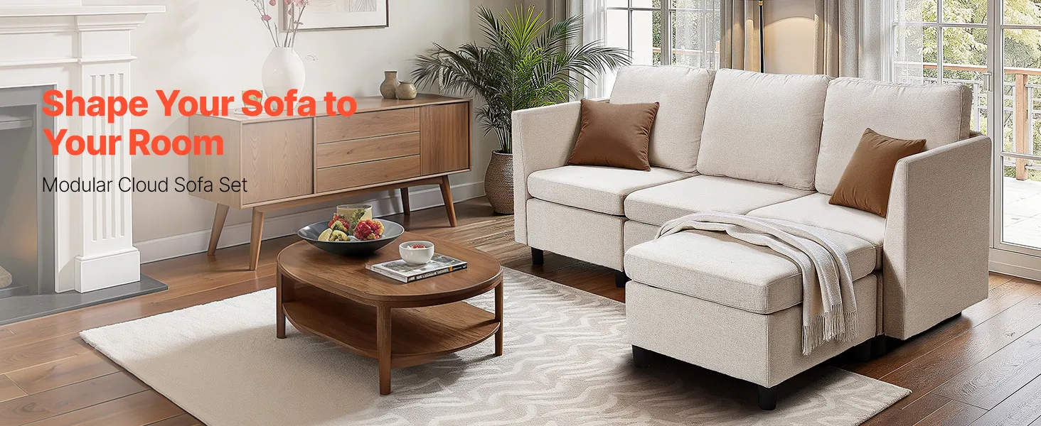 VEVOR Modular Sectional Sofa, 3-Seater Modular Sofa with Hidden Storage, Cloud Sectional Couch with Ottoman & High Rebound Sponge, Solid Wood Frame Upholstered Couch for Living Room, Bedroom, Beige
