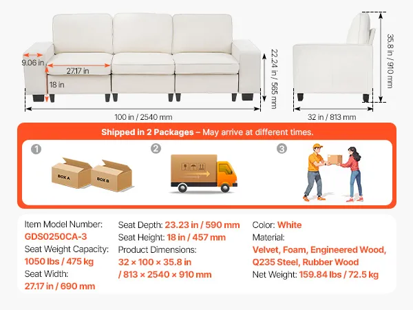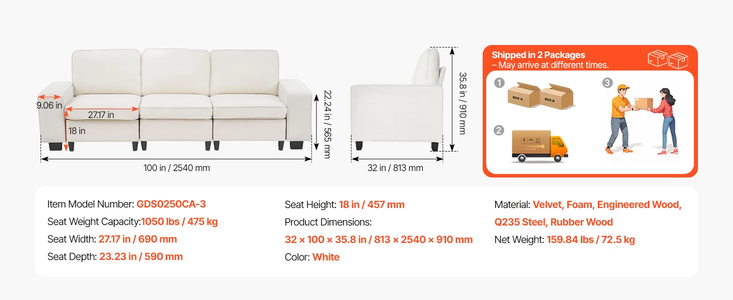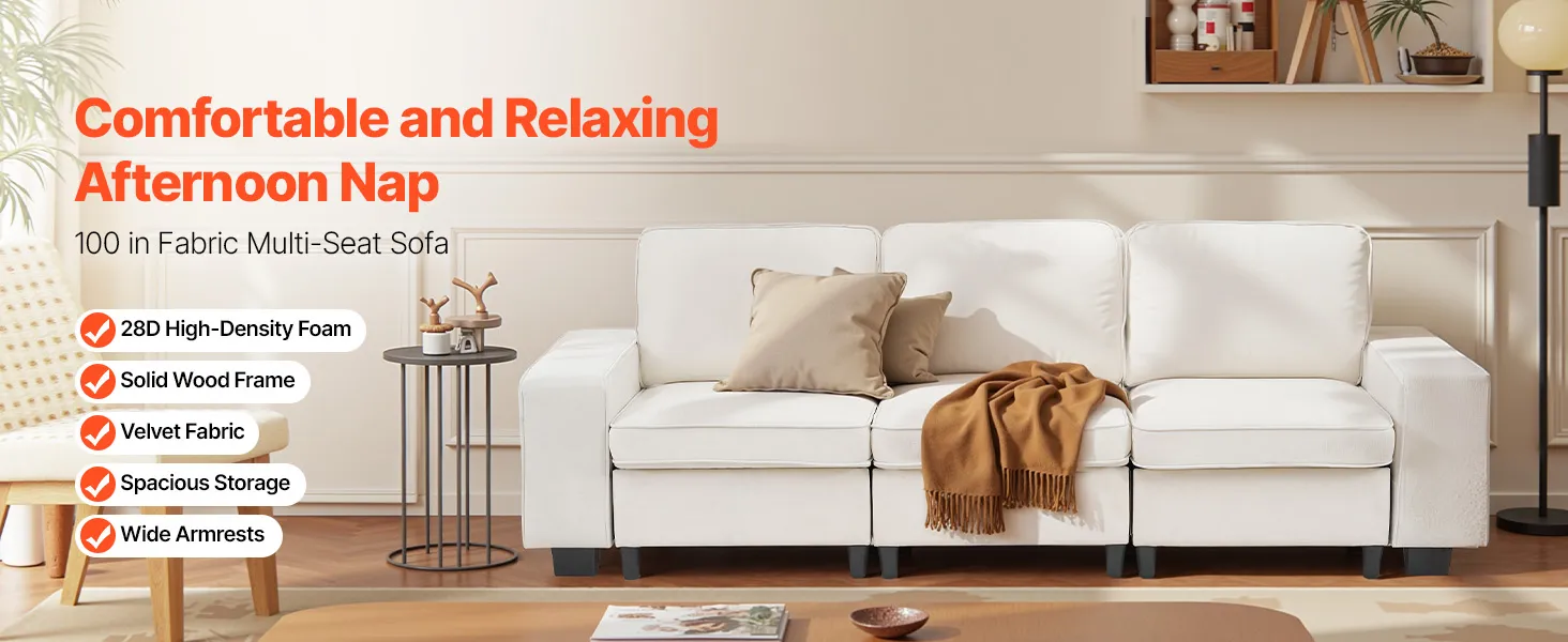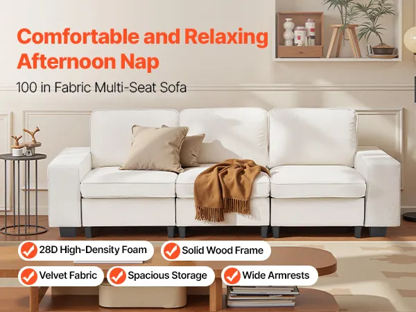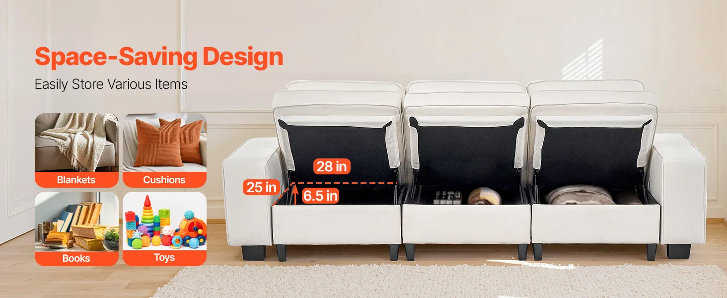 This 100 in / 2540 mm 3 steater sofa combines a solid wood frame with 28D high-density foam for exceptional durability and support. The sofa also includes spacious storage under each seat, perfect for storing blankets, pillows, books, toys, and more, keeping your living space organized.