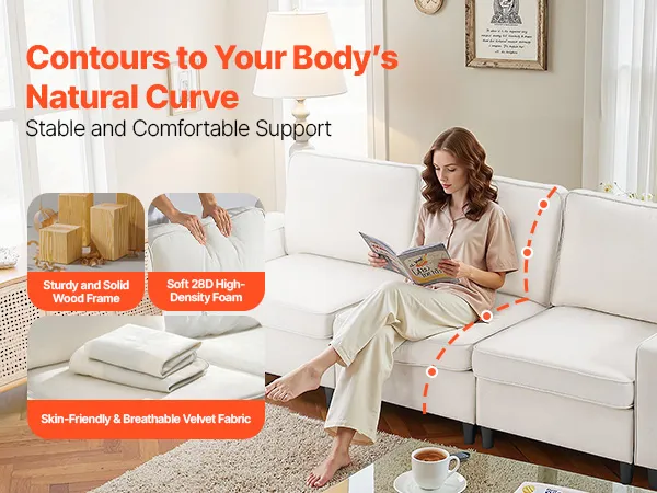 The 3 seater couch is designed to fit the natural curves of your body, providing firm yet comfortable support with the combination of the solid wood frame and soft 28D high-density foam. The breathable velvet fabric ensures lasting comfort, making your relaxation time even more enjoyable.