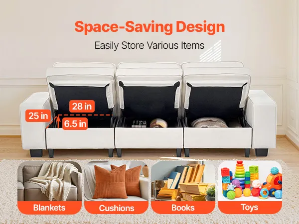 Each seat comes with generous under-seat storage 25 x 28 x 6.5 in / 635 x 710 x 165 mm, providing ample room to store blankets, cushions, books, toys, and more. This clever storage solution helps save space and keeps your home tidy and organized.
