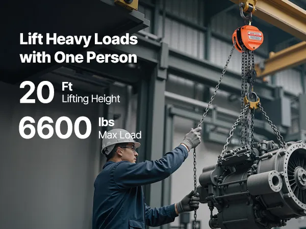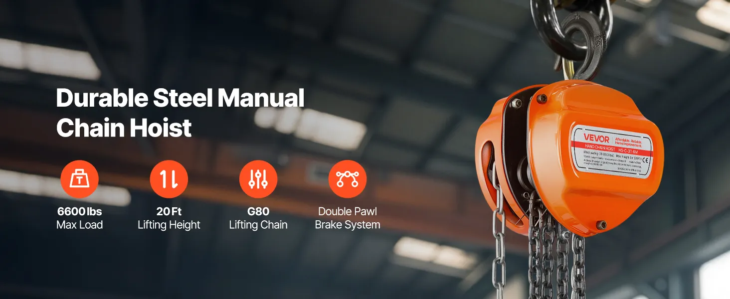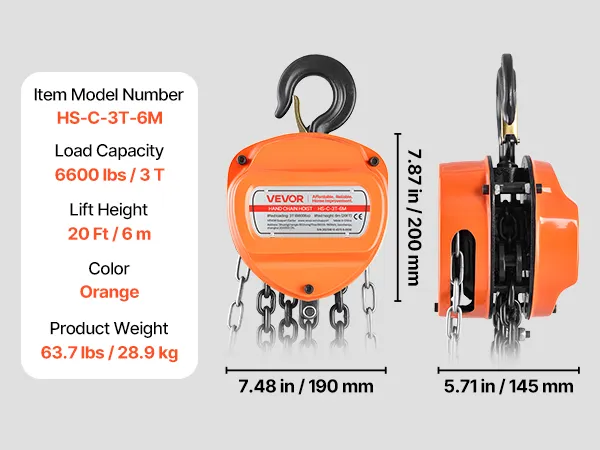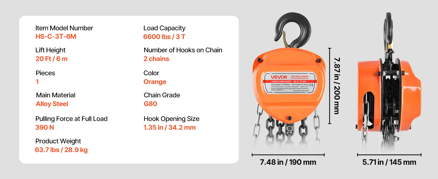 • 6600 lbs Heavy Duty Capacity: This hand chain hoist easily handles heavy lifting tasks, supporting up to 6600 lbs (3 T) and reaching heights up to 20 ft (6 m). Ideal for garages, construction sites, and warehouses