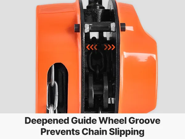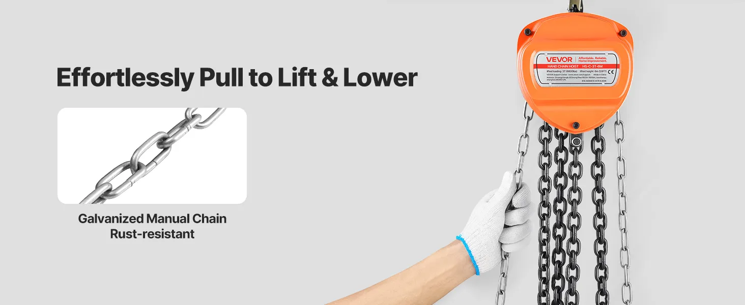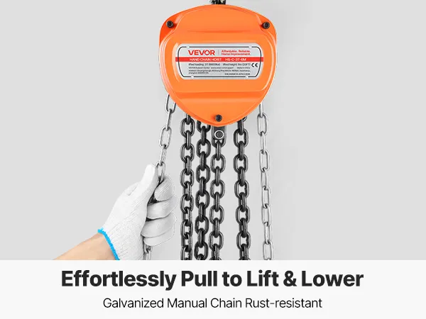 • Effortless Operation: Compact and user-friendly, this manual chain block hoist only requires 390N of pull force when fully loaded. The deep groove design keeps the chain secure, saving time on repairs and making lifting easy