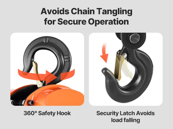 • 360° Rotating Hooks: Both hooks rotate 360° for easy, flexible positioning. The security lock of the manual chain fall ensures secure usage, and the adjustable lifting angle keeps the chain tangle-free and your work efficient
