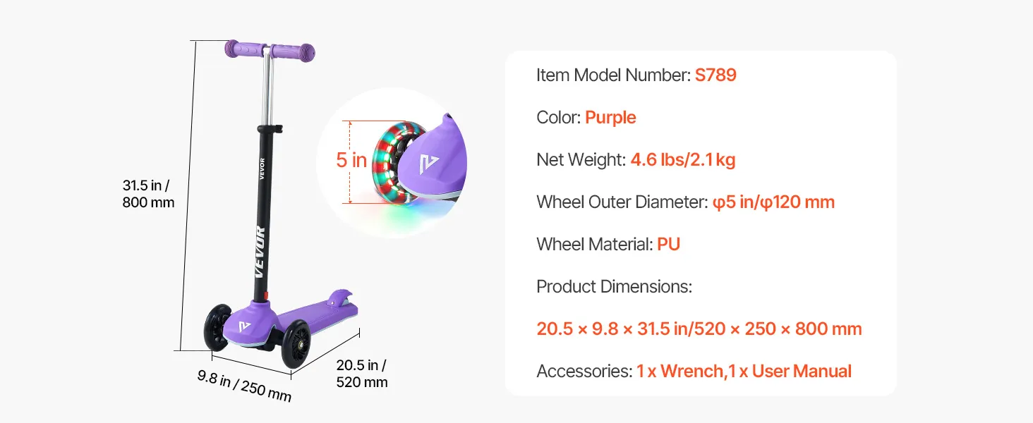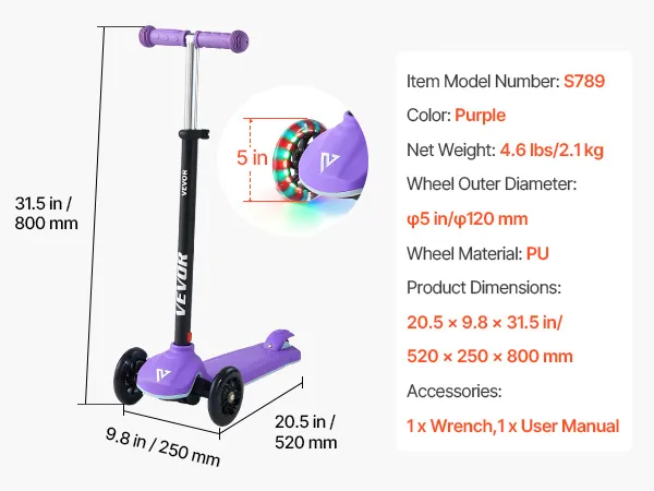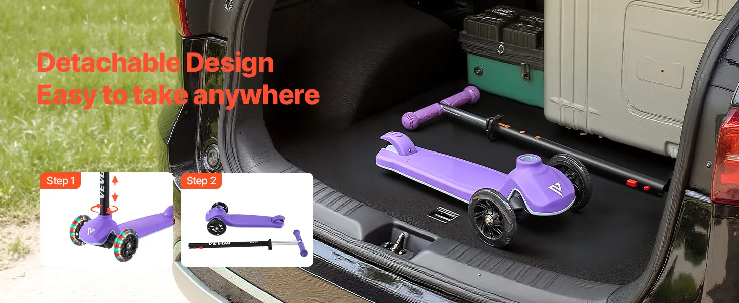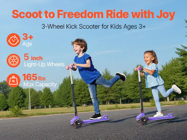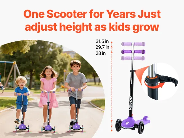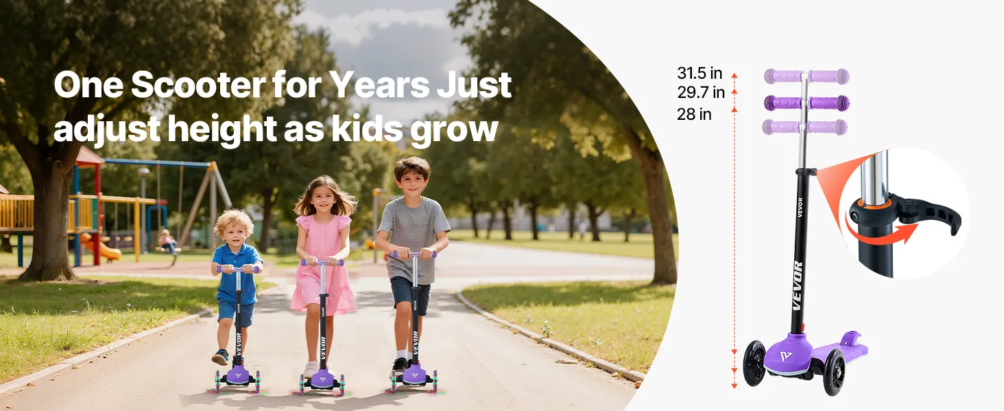 VEVOR Kick Scooter for Kids Ages 3+, 3-Wheel Toddler Scooter with Light-Up Wheels, Adjustable Height Handlebar, Wide Anti-Slip Deck, Lightweight Aluminum Frame for Boys & Girls up to 74.8 kg, Purple