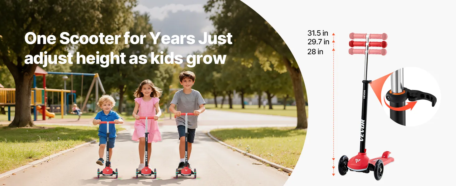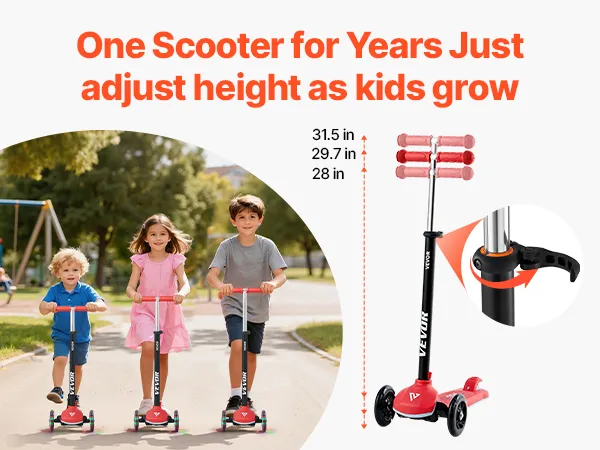 VEVOR Kick Scooter for Kids Ages 3+, 3-Wheel Toddler Scooter with Light-Up Wheels, Adjustable Height Handlebar, Wide Anti-Slip Deck, Lightweight Aluminum Frame for Boys and Girls up to 74.8 kg, Red