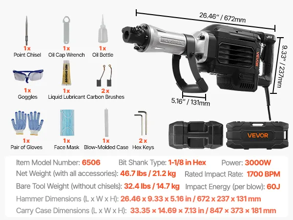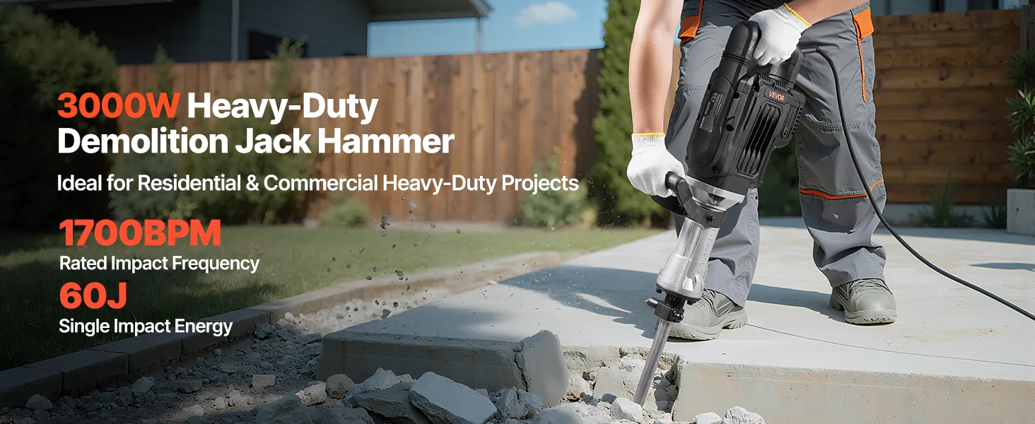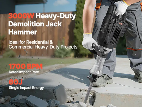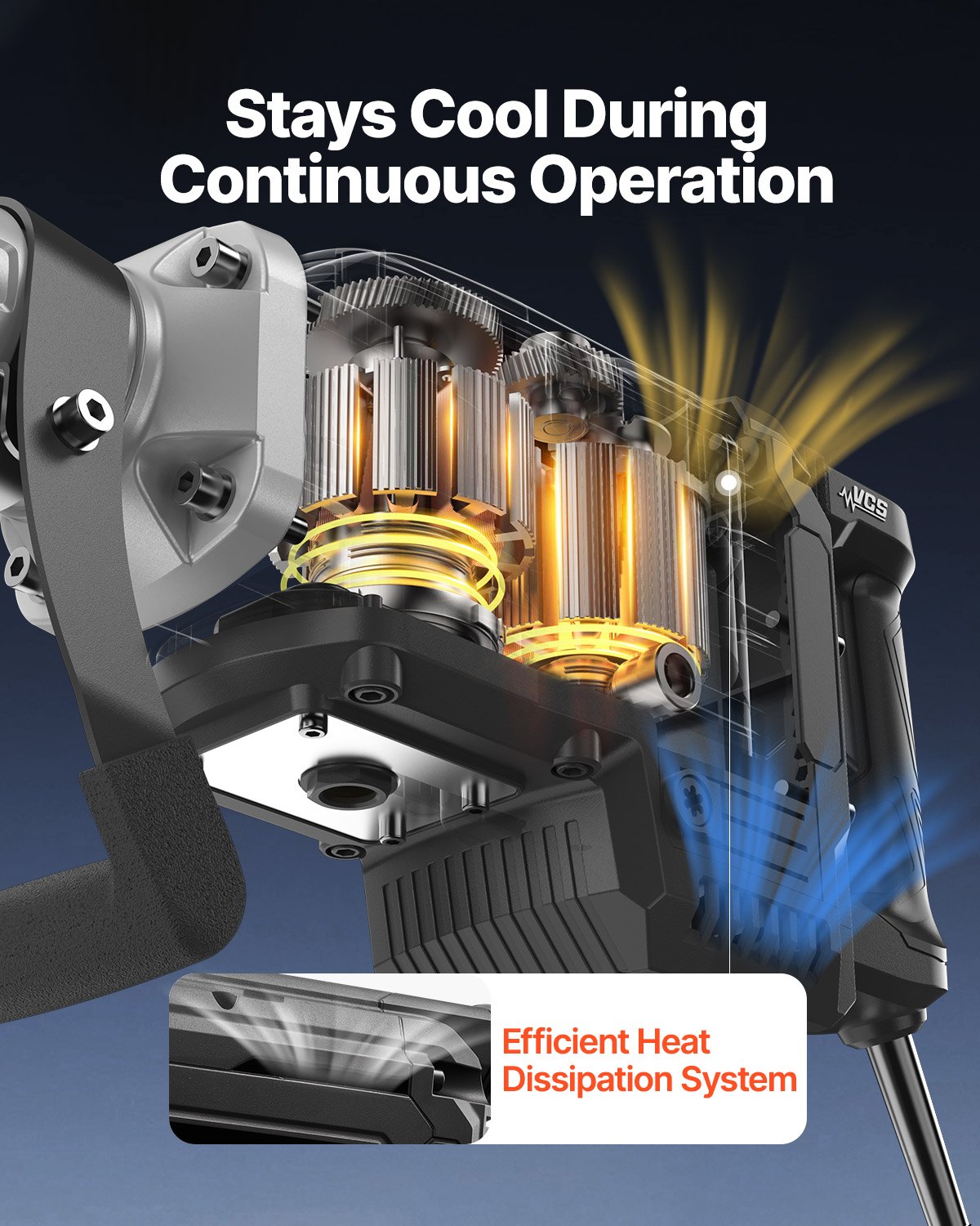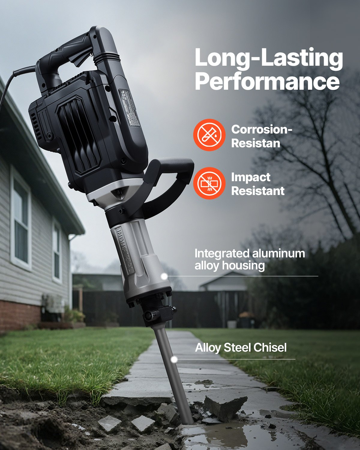 This demolition hammer features a 3000 W motor delivering 1700 BPM to break concrete, brick, and other tough materials. A 360° handle provides better control and less fatigue, while the aluminum housing ensures strength, durability, and cooling. Ideal for home or professional use.