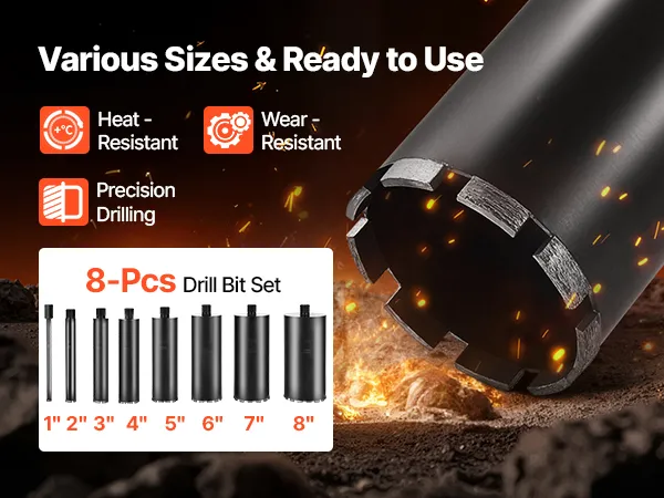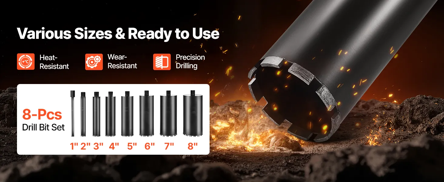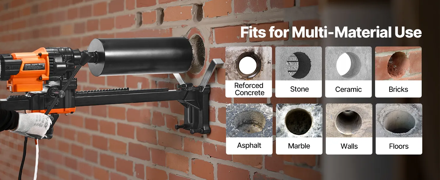VEVOR Diamond Core Drilling Machine, 20-200 mm Drilling Diameter, Stand-Mount Dry and Wet Concrete Core Drill Rig with 8 Drill Bits, 850 RPM Speed, UNC1 1/4-7 Thread, for Concrete Brick Stone, 3000W