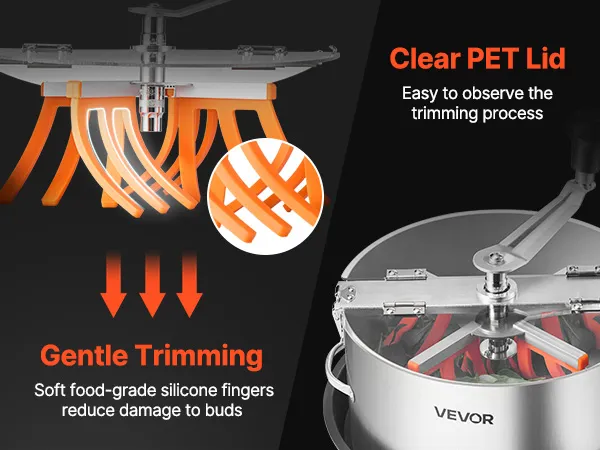 Effortlessly trim leaves and buds with this manual leaf trimmer. Equipped with a variable-speed motor, multiple blade options, and a clear acrylic lid, it ensures precise for various plant types. The stainless steel blades and food-grade silicone fingers offer clean cuts and low-damage trimming.