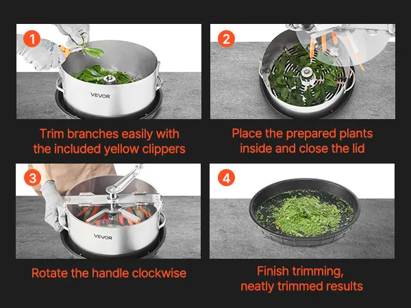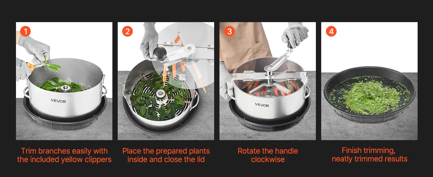 The manual bud trimmer machine trim excess stems, load your herbs, secure the lid, and rotate the handle clockwise. That's it! Enjoy a smooth, satisfying trimming experience—right from your home garden.