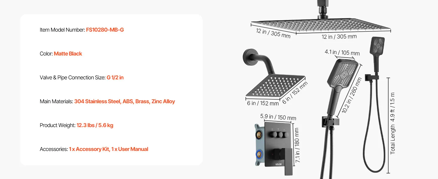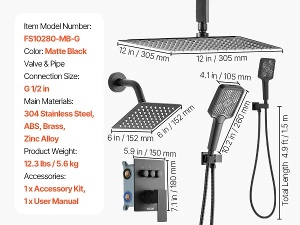 VEVOR Shower Faucet Set, 305 mm Ceiling Mount Rainfall Shower System with 152 mm Wall Mount Head and 4 in 1 Handheld Spray, Rotatable 3-Function Dual Rain Head Brass Valve and Trim Kit, Matte Black
