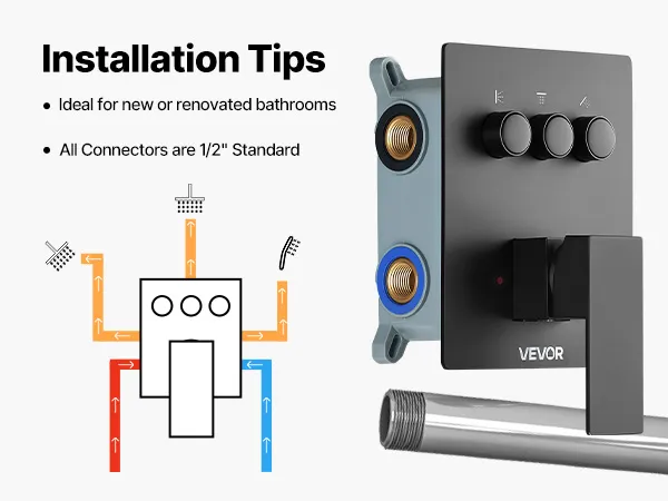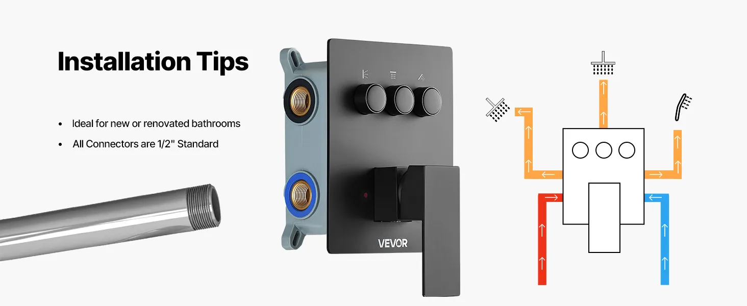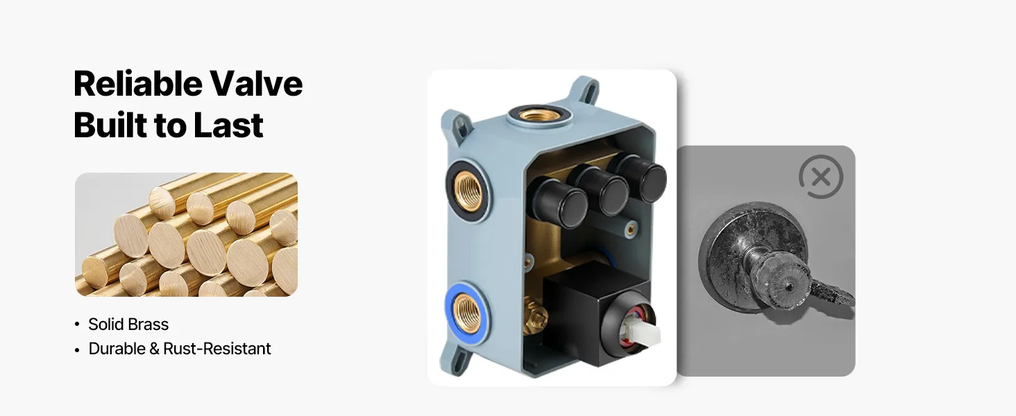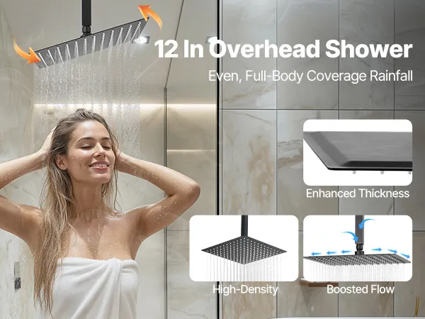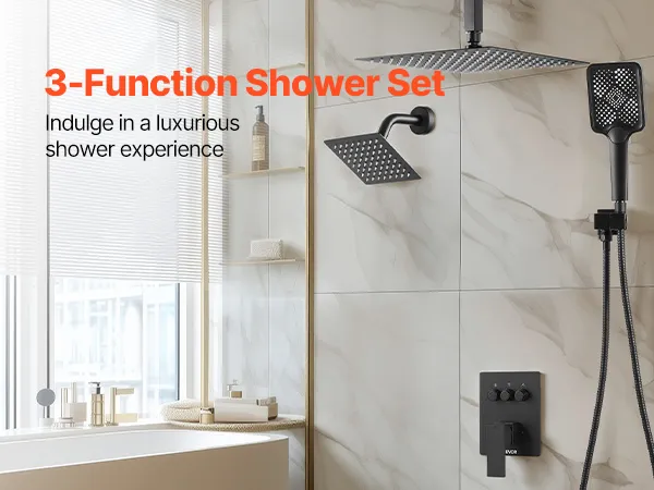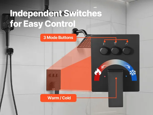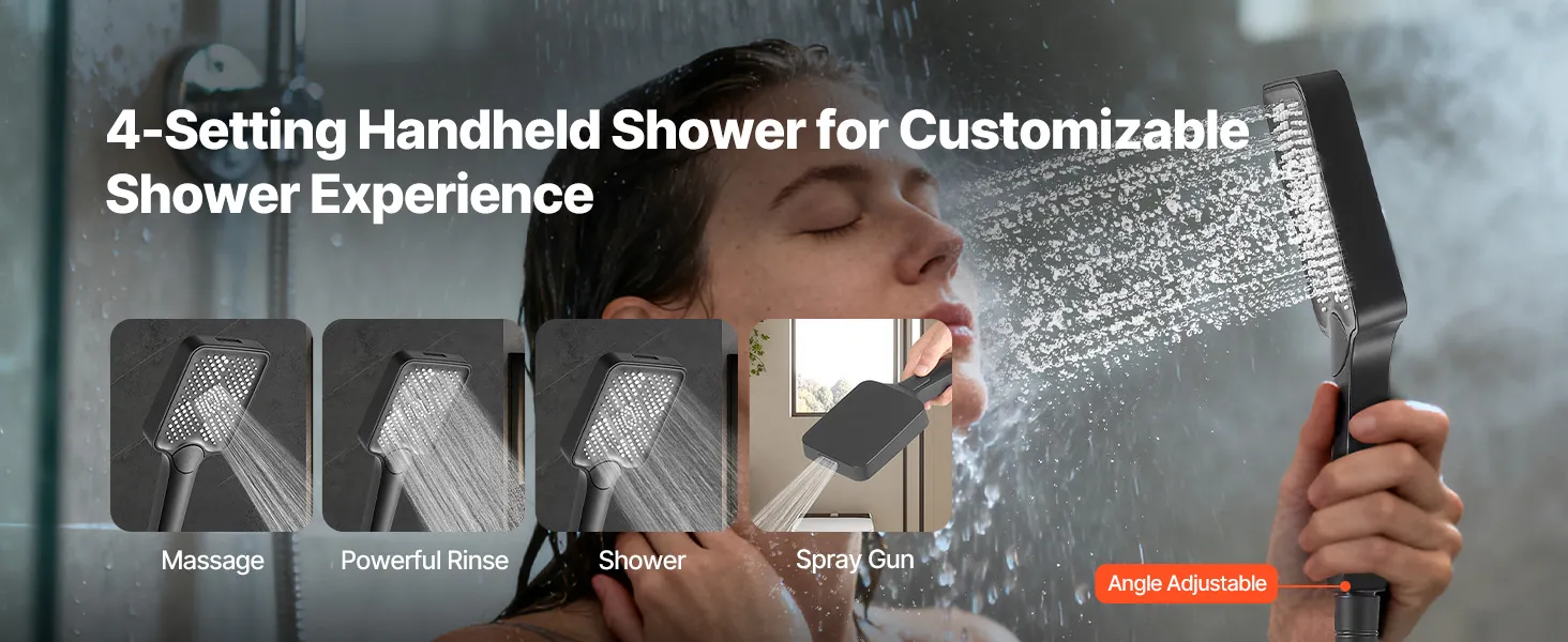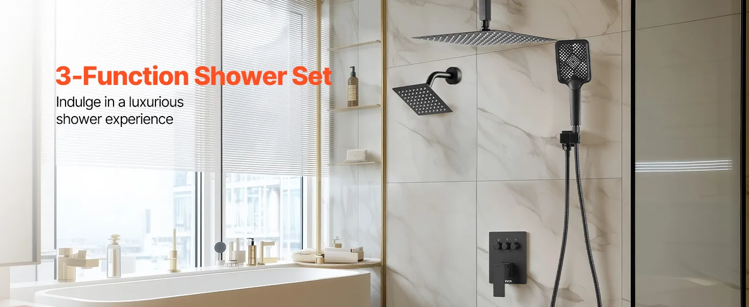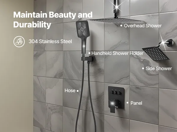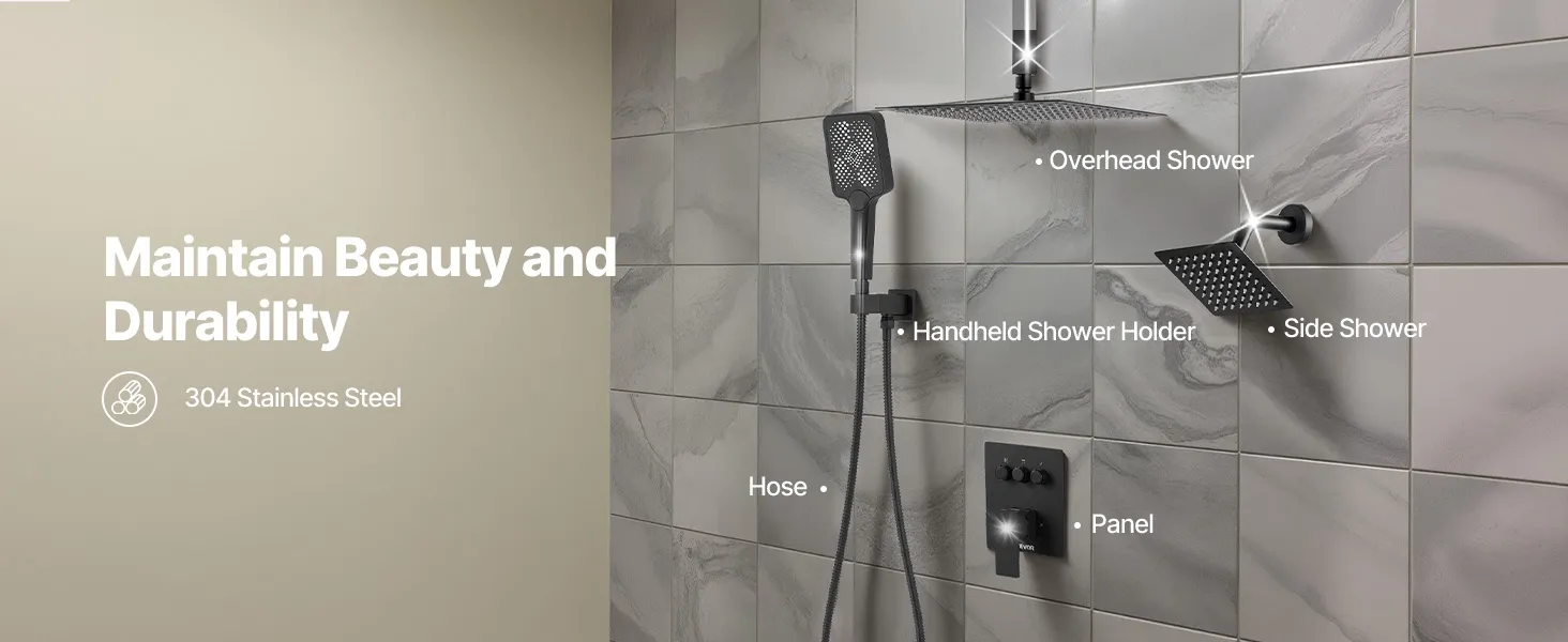 Our shower faucet set hides the plumbing behind the wall for a sleek, high-end bathroom look. It includes 3 refreshing shower functions—handheld, side, and overhead—for a full-body experience upgrade.
