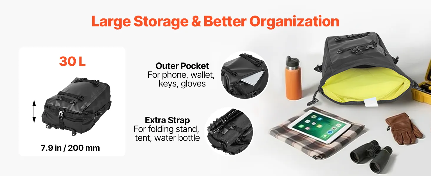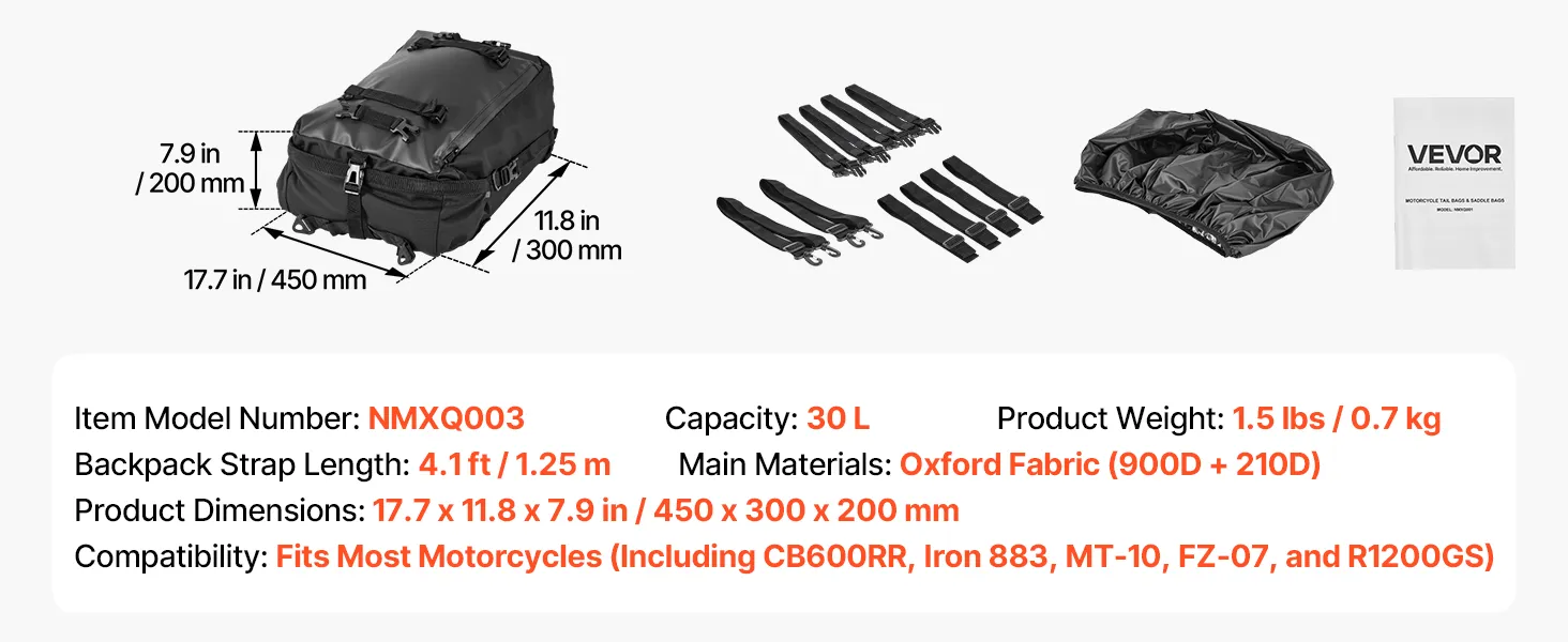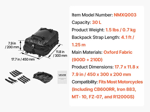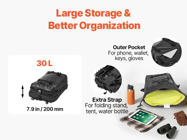 • 30 L Large Capacity: This lightweight motorcycle rear seat bag measures 17.7 x 11.8 x 7.9 in (L x W x H). It easily holds a 15-inch laptop, riding jacket, rain gear, food, iPad, and repair tools—everything you need for your ride