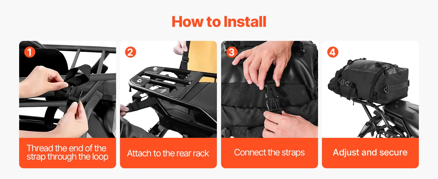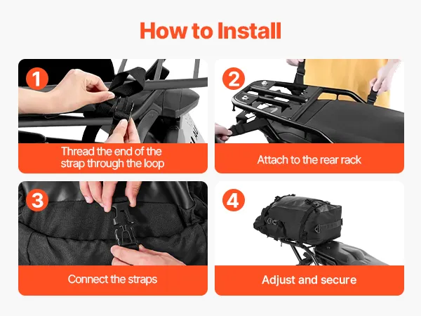 • Fit Most Motorcycles: This motorcycle tail bag fits most motorcycles, including touring, standard, cruiser, and dirt bikes. Four straps thread through the frame holes or rear handrail for quick installation, and tightening the buckles keeps it stable